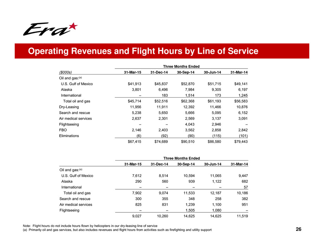 25 Notes: 1) NAV calculation only includes market value of helicopters that we own; it does not include any value for leased-in or managed helicopters that we operate 2) Helicopter market values based on annual desktop appraisal performed by Ascend Worldwide; new helicopters delivered subsequent to the last appraisal, if any, are reflected at gross cost 3) Based on most recent annual Ascend Worldwide appraisal as of 12/31/14; depreciated at 1% per quarter 4) Please refer to slide 2 of this presentation for additional statements regarding our NAV disclosure NAV per Share Calculation (in million, except share data) 12/31/14 3/31/15 Comments + FMV of Helicopters $912 $893 Assumes 1% quarterly depreciation; 5 helicopters sold + NBV of Other PP&E 164 169 + Working Capital 80 81 + Other Net Tangible Assets 44 45 - Total Debt (310) (304) - Deferred Taxes (217) (217) Net Asset Value $673 $667 Diluted Share Count 20.2 20.2 Current Share Price (5/4/2015) $22.08 Current Price % (Disc) / Prem NAV per Share (excl. Deferred Taxes) $43.91 $43.69 (49.5%) NAV per Share (incl. Deferred Taxes) $33.28 $33.04 (33.2%) Net Book Value Per Share $22.75 $22.84 (3.3%)