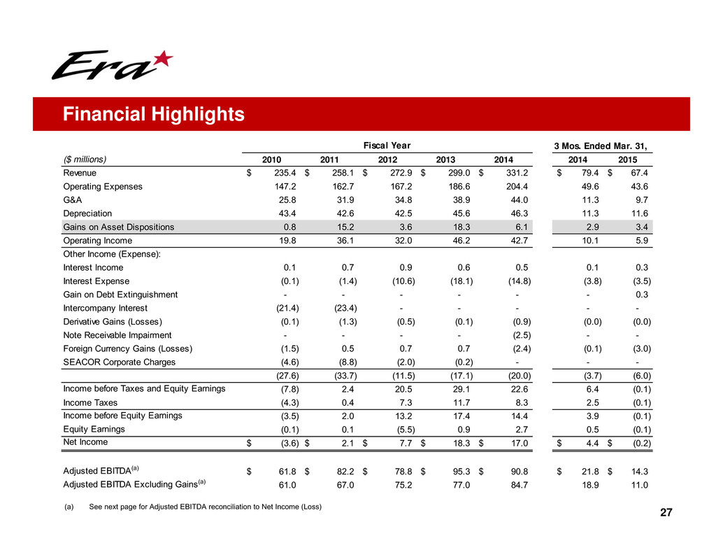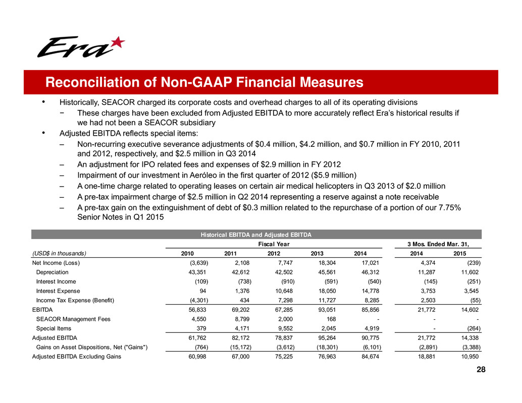• Historically, SEACOR charged its corporate costs and overhead charges to all of its operating divisions − These charges have been excluded from Adjusted EBITDA to more accurately reflect Era’s historical results if we had not been a SEACOR subsidiary • Adjusted EBITDA reflects special items: – Non-recurring executive severance adjustments of $0.4 million, $4.2 million, and $0.7 million in FY 2010, 2011 and 2012, respectively, and $2.5 million in Q3 2014 – An adjustment for IPO related fees and expenses of $2.9 million in FY 2012 – Impairment of our investment in Aeróleo in the first quarter of 2012 ($5.9 million) – A one-time charge related to operating leases on certain air medical helicopters in Q3 2013 of $2.0 million – A pre-tax impairment charge of $2.5 million in Q2 2014 representing a reserve against a note receivable – A pre-tax gain on the extinguishment of debt of $0.3 million related to the repurchase of a portion of our 7.75% Senior Notes in Q1 2015 28 Reconciliation of Non-GAAP Financial Measures Historical EBITDA and Adjusted EBITDA Fiscal Year 3 Mos. Ended Mar. 31, (USD$ in thousands) 2010 2011 2012 2013 2014 2014 2015 Net Income (Loss) (3,639) 2,108 7,747 18,304 17,021 4,374 (239) Depreciation 43,351 42,612 42,502 45,561 46,312 11,287 11,602 Interest Income (109) (738) (910) (591) (540) (145) (251) Interest Expense 94 1,376 10,648 18,050 14,778 3,753 3,545 Income Tax Expense (Benefit) (4,301) 434 7,298 11,727 8,285 2,503 (55) EBITDA 56,833 69,202 67,285 93,051 85,856 21,772 14,602 SEACOR Management Fees 4,550 8,799 2,000 168 - - - Special Items 379 4,171 9,552 2,045 4,919 - (264) Adjusted EBITDA 61,762 82,172 78,837 95,264 90,775 21,772 14,338 Gains on Asset Dispositions, Net ("Gains") (764) (15,172) (3,612) (18,301) (6,101) (2,891) (3,388) Adjusted EBITDA Excluding Gains 60,998 67,000 75,225 76,963 84,674 18,881 10,950
