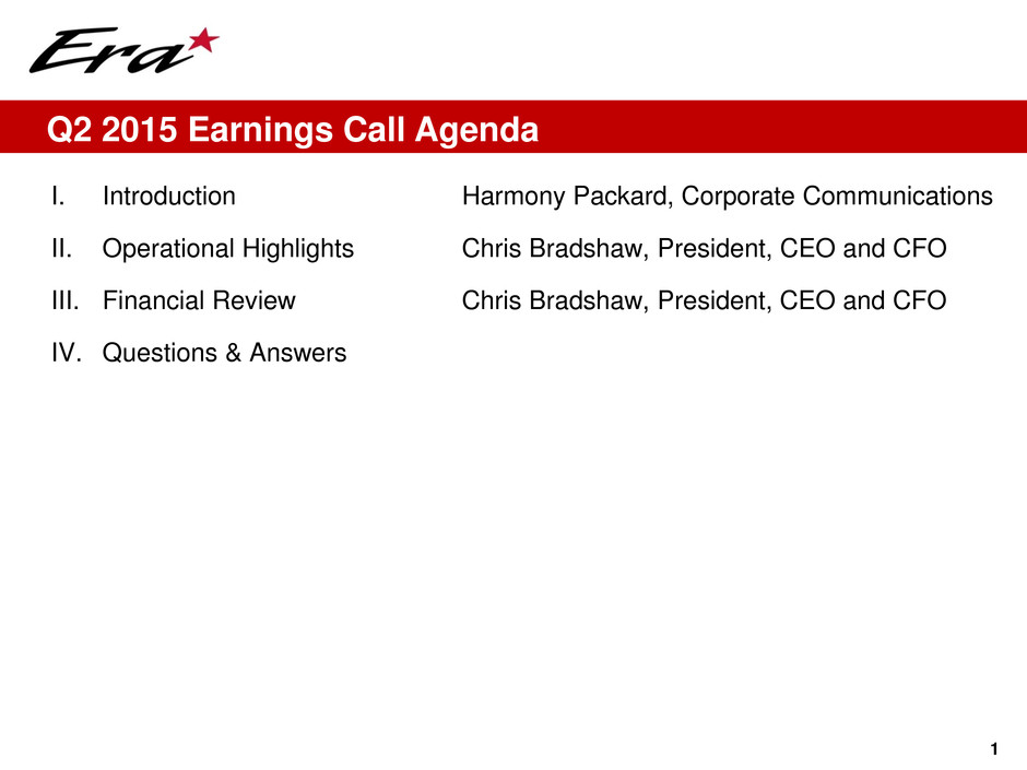 I. Introduction Harmony Packard, Corporate Communications II. Operational Highlights Chris Bradshaw, President, CEO and CFO III. Financial Review Chris Bradshaw, President, CEO and CFO IV. Questions & Answers Q2 2015 Earnings Call Agenda 1