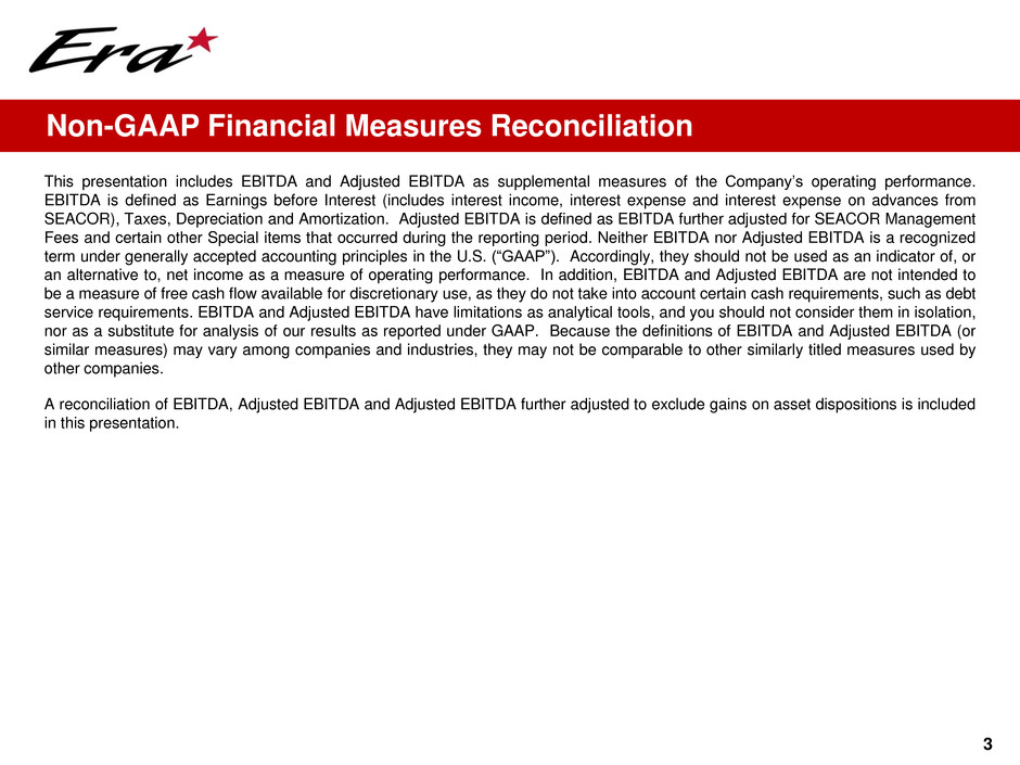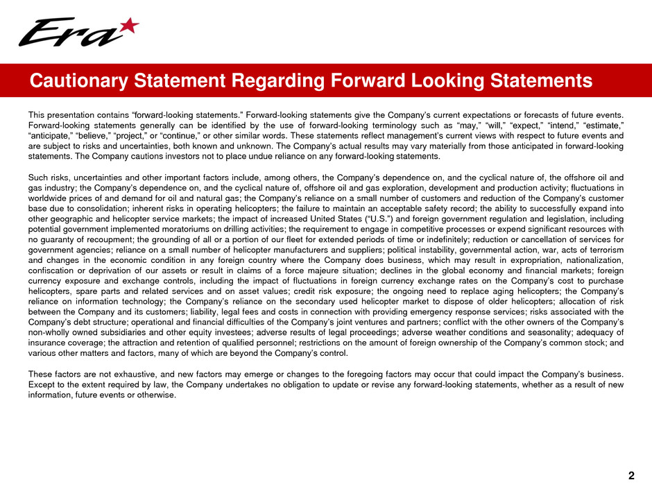 2 This presentation contains “forward-looking statements.” Forward-looking statements give the Company’s current expectations or forecasts of future events. Forward-looking statements generally can be identified by the use of forward-looking terminology such as “may,” “will,” “expect,” “intend,” “estimate,” “anticipate,” “believe,” “project,” or “continue,” or other similar words. These statements reflect management’s current views with respect to future events and are subject to risks and uncertainties, both known and unknown. The Company’s actual results may vary materially from those anticipated in forward-looking statements. The Company cautions investors not to place undue reliance on any forward-looking statements. Such risks, uncertainties and other important factors include, among others, the Company’s dependence on, and the cyclical nature of, the offshore oil and gas industry; the Company’s dependence on, and the cyclical nature of, offshore oil and gas exploration, development and production activity; fluctuations in worldwide prices of and demand for oil and natural gas; the Company’s reliance on a small number of customers and reduction of the Company’s customer base due to consolidation; inherent risks in operating helicopters; the failure to maintain an acceptable safety record; the ability to successfully expand into other geographic and helicopter service markets; the impact of increased United States (“U.S.”) and foreign government regulation and legislation, including potential government implemented moratoriums on drilling activities; the requirement to engage in competitive processes or expend significant resources with no guaranty of recoupment; the grounding of all or a portion of our fleet for extended periods of time or indefinitely; reduction or cancellation of services for government agencies; reliance on a small number of helicopter manufacturers and suppliers; political instability, governmental action, war, acts of terrorism and changes in the economic condition in any foreign country where the Company does business, which may result in expropriation, nationalization, confiscation or deprivation of our assets or result in claims of a force majeure situation; declines in the global economy and financial markets; foreign currency exposure and exchange controls, including the impact of fluctuations in foreign currency exchange rates on the Company’s cost to purchase helicopters, spare parts and related services and on asset values; credit risk exposure; the ongoing need to replace aging helicopters; the Company’s reliance on information technology; the Company’s reliance on the secondary used helicopter market to dispose of older helicopters; allocation of risk between the Company and its customers; liability, legal fees and costs in connection with providing emergency response services; risks associated with the Company’s debt structure; operational and financial difficulties of the Company’s joint ventures and partners; conflict with the other owners of the Company’s non-wholly owned subsidiaries and other equity investees; adverse results of legal proceedings; adverse weather conditions and seasonality; adequacy of insurance coverage; the attraction and retention of qualified personnel; restrictions on the amount of foreign ownership of the Company’s common stock; and various other matters and factors, many of which are beyond the Company’s control. These factors are not exhaustive, and new factors may emerge or changes to the foregoing factors may occur that could impact the Company’s business. Except to the extent required by law, the Company undertakes no obligation to update or revise any forward-looking statements, whether as a result of new information, future events or otherwise. Cautionary Statement Regarding Forward Looking Statements