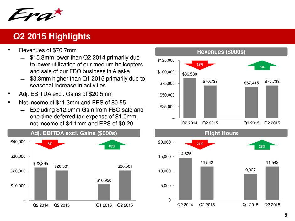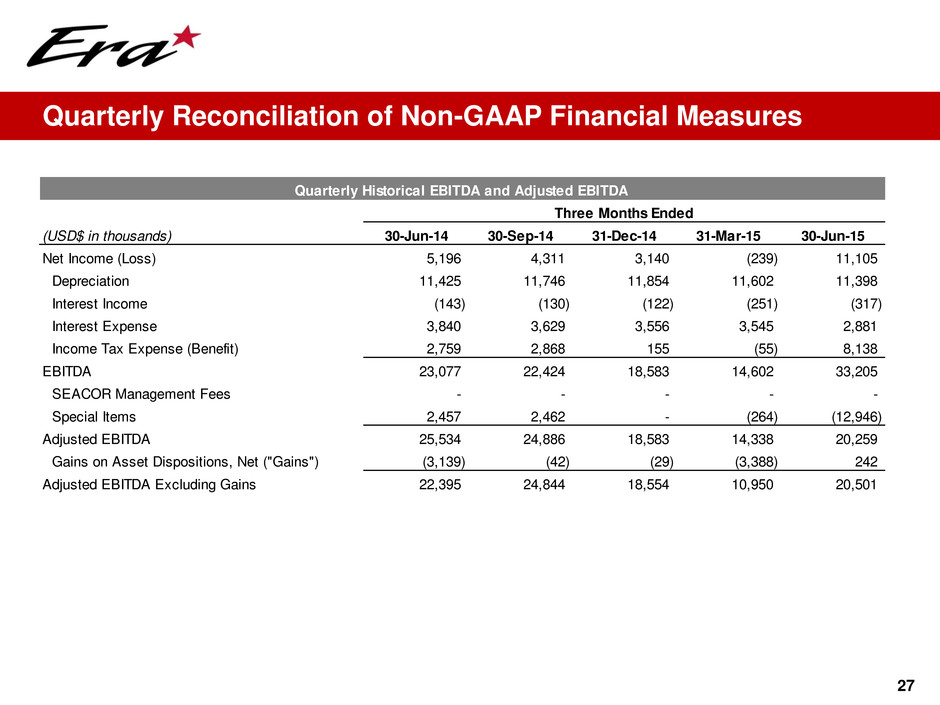 • Historically, SEACOR charged its corporate costs and overhead charges to all of its operating divisions − These charges have been excluded from Adjusted EBITDA to more accurately reflect Era’s historical results as if we had not been a SEACOR subsidiary • Adjusted EBITDA reflects special items: – Executive severance adjustments of $0.4 million, $4.2 million, and $0.7 million in FY 2010, 2011 and 2012, respectively, and $2.5 million in Q3 2014 – An adjustment for IPO related fees and expenses of $2.9 million in FY 2012 – Impairment of our investment in Aeróleo in the first quarter of 2012 ($5.9 million) – A one-time charge related to operating leases on certain air medical helicopters in Q3 2013 of $2.0 million – A pre-tax impairment charge of $2.5 million in Q2 2014 representing a reserve against a note receivable – A pre-tax gain on the extinguishment of debt of $0.3 million related to the repurchase of a portion of our 7.75% Senior Notes in Q1 2015 – A pre-tax gain of $12.9 million on the sale of our FBO in Alaska in Q2 2015 26 Reconciliation of Non-GAAP Financial Measures Historical EBITDA and Adjusted EBITDA Quarterly Historical Fiscal Year 6 Mos. Ended June 30, (USD$ in thousands) 2010 2011 2012 2013 2014 2014 2015 Net Income (Loss) (3,639) 2,108 7,747 18,304 17,021 9,570 10,866 Depreciation 43,351 42,612 42,502 45,561 46,312 22,712 23,000 Int rest In ome (109) (738) (910) (591) (540) (288) (568) I t rest Ex nse 94 1,376 10,648 18,050 14,778 7,593 6,426 I com Tax Expense (Benefit) (4,301) 434 7,298 11,727 8,285 5,262 8,083 EBITD 56,833 69,202 67,285 93,051 85,856 44,849 47,807 SEACOR Management Fees 4,550 8,799 2,000 168 - - - Special Items 379 4,171 9,552 2,045 4,919 2,457 (13,210) Adjusted EBITDA 61,762 82,172 78,837 95,264 90,775 47,306 34,597 Gains on Asset Dispositions, Net ("Gains") (764) (15,172) (3,612) (18,301) (6,101) (6,030) (3,146) Adjusted EBITDA Excluding Gains 60,998 67,000 75,225 76,963 84,674 41,276 31,451