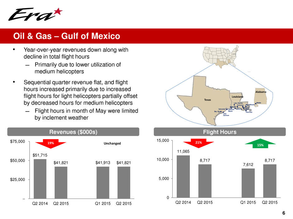 $86,580 $70,738 $67,415 $70,738 – $25,000 $50,000 $75,000 $100,000 $125,000 Q2 2014 Q2 2015 Q1 2015 Q2 2015 14,625 11,542 9,027 11,542 0 5,000 10,000 15,000 20,000 Q2 2014 Q2 2015 Q1 2015 Q2 2015 • Revenues of $70.7mm ̶ $15.8mm lower than Q2 2014 primarily due to lower utilization of our medium helicopters and sale of our FBO business in Alaska ̶ $3.3mm higher than Q1 2015 primarily due to seasonal increase in activities • Adj. EBITDA excl. Gains of $20.5mm • Net income of $11.3mm and EPS of $0.55 ̶ Excluding $12.9mm Gain from FBO sale and one-time deferred tax expense of $1.0mm, net income of $4.1mm and EPS of $0.20 5 Q2 2015 Highlights Revenues ($000s) Adj. EBITDA excl. Gains ($000s) Flight Hours 18% 5% 21% 28% 8% 87% $22,395 $20,501 $10,950 $20,501 – $10,000 $20,000 $30,000 $40,000 Q2 2014 Q2 2015 Q1 2015 Q2 2015