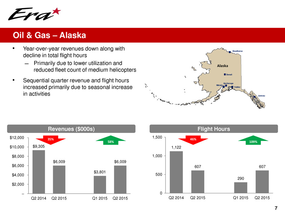 $51,715 $41,821 $41,913 $41,821 – $25,000 $50,000 $75,000 Q2 2014 Q2 2015 Q1 2015 Q2 2015 11,065 8,717 7,612 8,717 0 5,000 10,000 15,000 Q2 2014 Q2 2015 Q1 2015 Q2 2015 6 Oil & Gas – Gulf of Mexico Revenues ($000s) Flight Hours • Year-over-year revenues down along with decline in total flight hours ̶ Primarily due to lower utilization of medium helicopters • Sequential quarter revenue flat, and flight hours increased primarily due to increased flight hours for light helicopters partially offset by decreased hours for medium helicopters ̶ Flight hours in month of May were limited by inclement weather 19% 21% 15%Unchanged Alabama Mobile Fourchon Lake Charles Johnson Bayou Dulac Abbeville New OrleansSchreiver Houma Louisiana Lake Jackson Texas Galveston Bay City Cameron