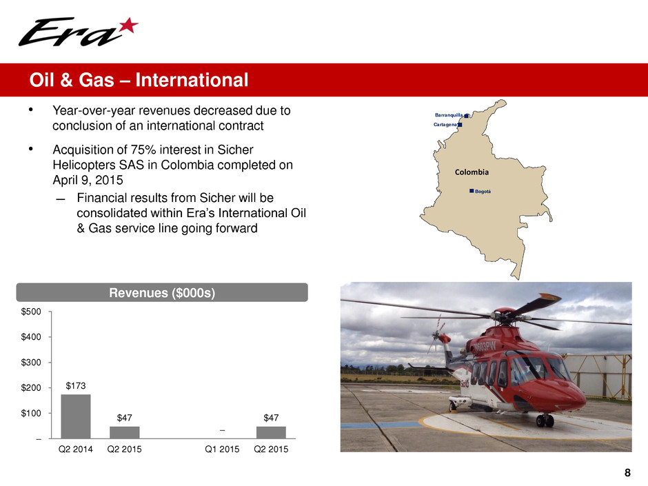 $9,305 $6,009 $3,801 $6,009 – $2,000 $4,000 $6,000 $8,000 $10,000 $12,000 Q2 2014 Q2 2015 Q1 2015 Q2 2015 1,122 607 290 607 0 500 1,000 1,500 Q2 2014 Q2 2015 Q1 2015 Q2 2015 7 Oil & Gas – Alaska Revenues ($000s) Flight Hours 46% 109% 35% 58% • Year-over-year revenues down along with decline in total flight hours ̶ Primarily due to lower utilization and reduced fleet count of medium helicopters • Sequential quarter revenue and flight hours increased primarily due to seasonal increase in activities Juneau Valdez Anchorage Nikiski Denali Deadhorse Alaska