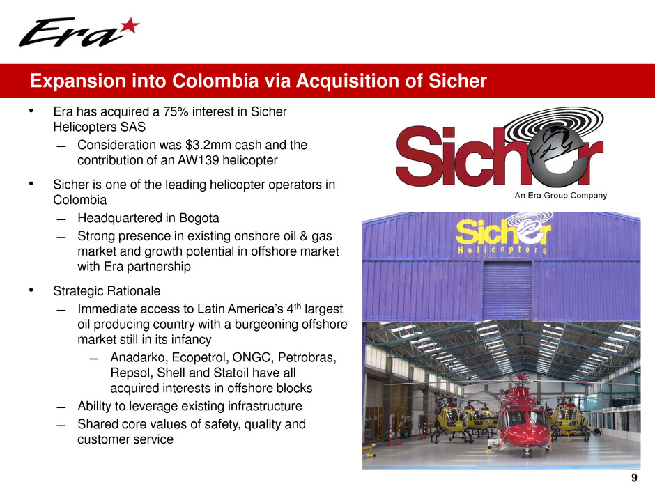 8 Oil & Gas – International Revenues ($000s) • Year-over-year revenues decreased due to conclusion of an international contract • Acquisition of 75% interest in Sicher Helicopters SAS in Colombia completed on April 9, 2015 ̶ Financial results from Sicher will be consolidated within Era’s International Oil & Gas service line going forward $173 $47 – $47 – $100 $200 $300 $400 $500 Q2 2014 Q2 2015 Q1 2015 Q2 2015 Bogotá Colombia Barranquilla Cartagena