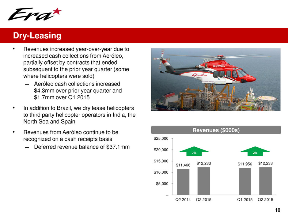 9 Expansion into Colombia via Acquisition of Sicher • Era has acquired a 75% interest in Sicher Helicopters SAS ̶ Consideration was $3.2mm cash and the contribution of an AW139 helicopter • Sicher is one of the leading helicopter operators in Colombia ̶ Headquartered in Bogota ̶ Strong presence in existing onshore oil & gas market and growth potential in offshore market with Era partnership • Strategic Rationale ̶ Immediate access to Latin America’s 4th largest oil producing country with a burgeoning offshore market still in its infancy ̶ Anadarko, Ecopetrol, ONGC, Petrobras, Repsol, Shell and Statoil have all acquired interests in offshore blocks ̶ Ability to leverage existing infrastructure ̶ Shared core values of safety, quality and customer service