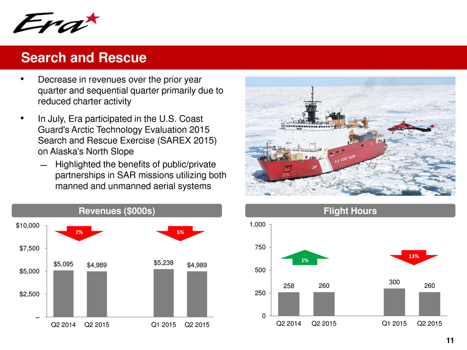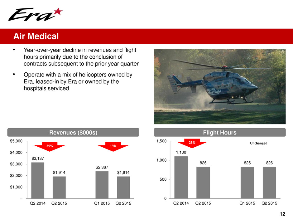 $5,095 $4,989 $5,238 $4,989 – $2,500 $5,000 $7,500 $10,000 Q2 2014 Q2 2015 Q1 2015 Q2 2015 258 260 300 260 0 250 500 750 1,000 Q2 2014 Q2 2015 Q1 2015 Q2 2015 11 Search and Rescue Revenues ($000s) Flight Hours • Decrease in revenues over the prior year quarter and sequential quarter primarily due to reduced charter activity • In July, Era participated in the U.S. Coast Guard's Arctic Technology Evaluation 2015 Search and Rescue Exercise (SAREX 2015) on Alaska's North Slope ̶ Highlighted the benefits of public/private partnerships in SAR missions utilizing both manned and unmanned aerial systems 13% 2% 5% 1%