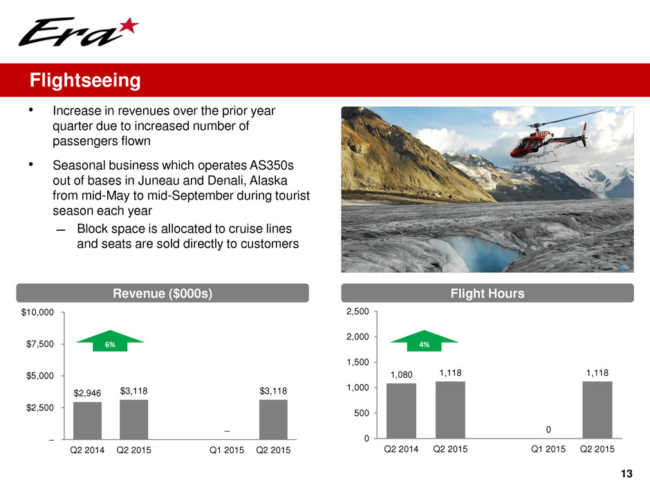 $3,137 $1,914 $2,367 $1,914 – $1,000 $2,000 $3,000 $4,000 $5,000 Q2 2014 Q2 2015 Q1 2015 Q2 2015 1,100 826 825 826 0 500 1,000 1,500 Q2 2014 Q2 2015 Q1 2015 Q2 2015 12 • Year-over-year decline in revenues and flight hours primarily due to the conclusion of contracts subsequent to the prior year quarter • Operate with a mix of helicopters owned by Era, leased-in by Era or owned by the hospitals serviced Air Medical Revenues ($000s) Flight Hours 25% 39% 19% Unchanged