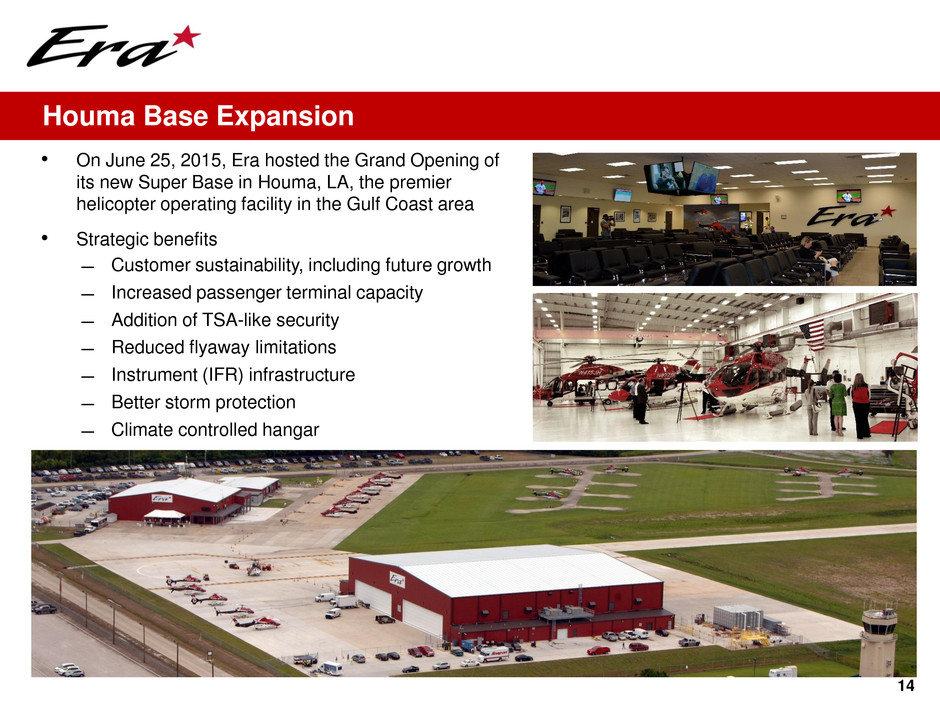 14 Houma Base Expansion • On June 25, 2015, Era hosted the Grand Opening of its new Super Base in Houma, LA, the premier helicopter operating facility in the Gulf Coast area • Strategic benefits ̶ Customer sustainability, including future growth ̶ Increased passenger terminal capacity ̶ Addition of TSA-like security ̶ Reduced flyaway limitations ̶ Instrument (IFR) infrastructure ̶ Better storm protection ̶ Climate controlled hangar
