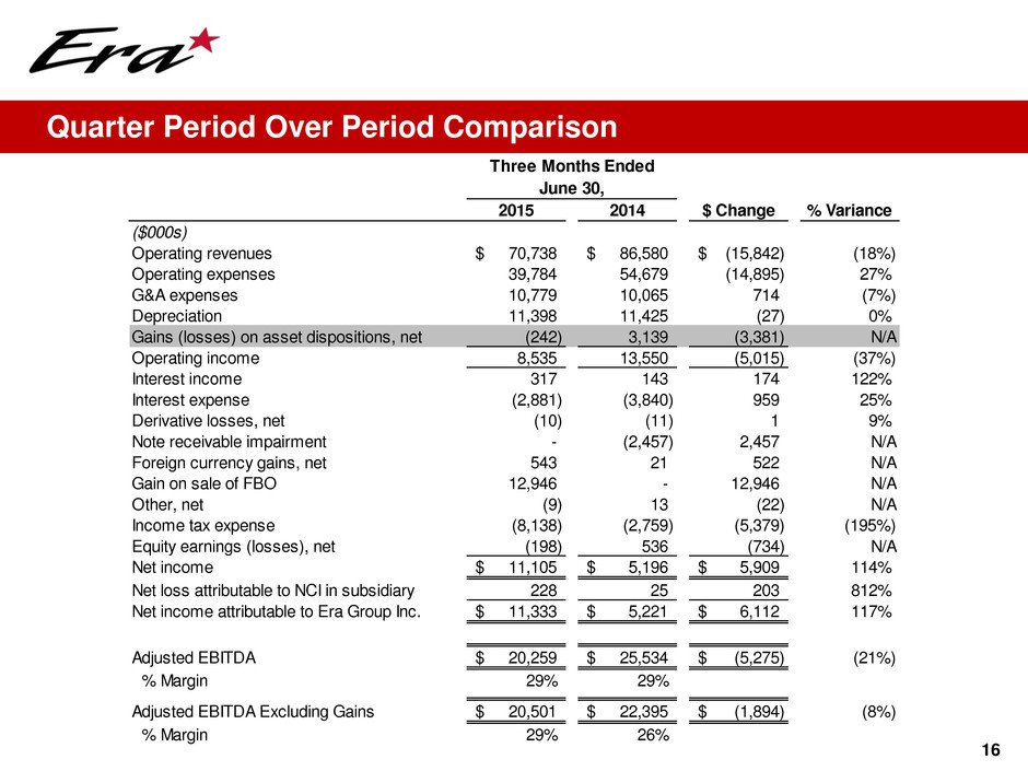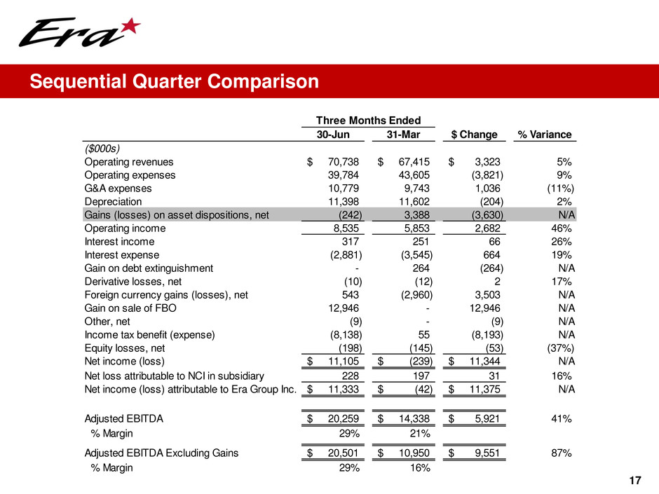 16 Quarter Period Over Period Comparison Three Months Ended June 30, 2015 2014 $ Change % Variance ($000s) Operating revenues 70,738$ 86,580$ (15,842)$ (18%) Operating expenses 39,784 54,679 (14,895) 27% G&A expenses 10,779 10,065 714 (7%) Depreciation 11,398 11,425 (27) 0% Gains (losses) on asset dispositions, net (242) 3,139 (3,381) N/A Operating income 8,535 13,550 (5,015) (37%) Interest income 317 143 174 122% Interest expense (2,881) (3,840) 959 25% Derivative losses, net (10) (11) 1 9% Note receivable impairment - (2,457) 2,457 N/A Foreign currency gains, net 543 21 522 N/A Gain on sale of FBO 12,946 - 12,946 N/A Other, net (9) 13 (22) N/A Income tax expense (8,138) (2,759) (5,379) (195%) Equity earnings (losses), net (198) 536 (734) N/A Net income 11,105$ 5,196$ 5,909$ 114% Net loss attributable to NCI in subsidiary 228 25 203 812% Net income attributable to Era Group Inc. 11,333$ 5,221$ 6,112$ 117% Adjusted EBITDA 20,259$ 25,534$ (5,275)$ (21%) % Margin 29% 29% Adjusted EBITDA Excluding Gains 20,501$ 22,395$ (1,894)$ (8%) % Margin 29% 26%