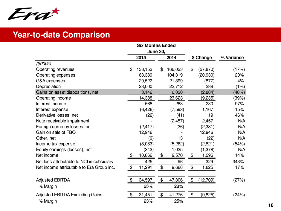 17 Sequential Quarter Comparison Three Months Ended 30-Jun 31-Mar $ Change % Variance ($000s) Operating revenues 70,738$ 67,415$ 3,323$ 5% Operating expenses 39,784 43,605 (3,821) 9% G&A expenses 10,779 9,743 1,036 (11%) Depreciation 11,398 11,602 (204) 2% Gains (losses) on asset dispositions, net (242) 3,388 (3,630) N/A Operating income 8,535 5,853 2,682 46% Interest income 317 251 66 26% Interest expense (2,881) (3,545) 664 19% Gain on debt extinguishment - 264 (264) N/A Derivative losses, net (10) (12) 2 17% Foreign currency gains (losses), net 543 (2,960) 3,503 N/A Gain on sale of FBO 12,946 - 12,946 N/A Other, net (9) - (9) N/A Income tax benefit (expense) (8,138) 55 (8,193) N/A Equity losses, net (198) (145) (53) (37%) Net income (loss) 11,105$ (239)$ 11,344$ N/A Net loss attributable to NCI in subsidiary 228 197 31 16% Net income (loss) attributable to Era Group Inc. 11,333$ (42)$ 11,375$ N/A Adjusted EBITDA 20,259$ 14,338$ 5,921$ 41% % Margin 29% 21% Adjusted EBITDA Excluding Gains 20,501$ 10,950$ 9,551$ 87% % Margin 29% 16%