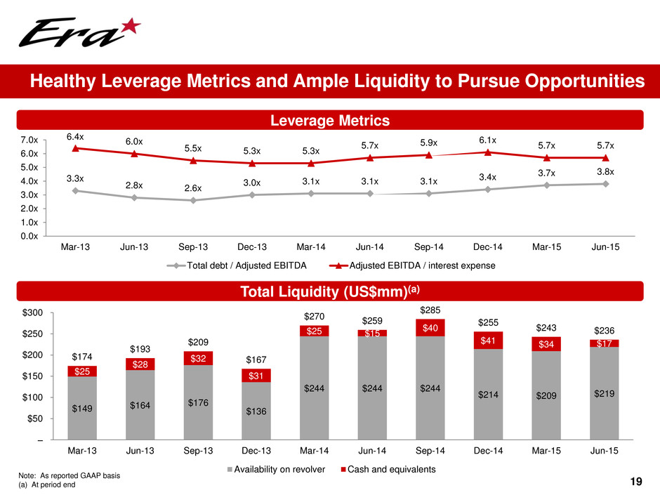 18 Year-to-date Comparison Six Months Ended June 30, 2015 2014 $ Change % Variance ($000s) Operating revenues 138,153$ 166,023$ (27,870)$ (17%) Operating expenses 83,389 104,319 (20,930) 20% G&A expenses 20,522 21,399 (877) 4% Depreciation 23,000 22,712 288 (1%) Gains on asset dispositions, net 3,146 6,030 (2,884) (48%) Operating income 14,388 23,623 (9,235) (39%) Interest income 568 288 280 97% Interest expense (6,426) (7,593) 1,167 15% Derivative losses, net (22) (41) 19 46% Note receivable impairment - (2,457) 2,457 N/A Foreign currency losses, net (2,417) (36) (2,381) N/A Gain on sale of FBO 12,946 - 12,946 N/A Other, net (9) 13 (22) N/A Income tax expense (8,083) (5,262) (2,821) (54%) Equity earnings (losses), net (343) 1,035 (1,378) N/A Net income 10,866$ 9,570$ 1,296$ 14% Net loss attributable to NCI in subsidiary 425 96 329 343% Net income attributable to Era Group Inc. 11,291$ 9,666$ 1,625$ 17% Adjusted EBITDA 34,597$ 47,306$ (12,709)$ (27%) % Margin 25% 28% Adjusted EBITDA Excluding Gains 31,451$ 41,276$ (9,825)$ (24%) % Margin 23% 25%