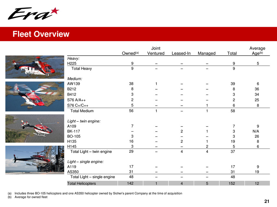 21 Owned(a) Joint Ventured Leased-In Managed Total Average Age(b) Heavy: H225 9 – – – 9 5 Total Heavy 9 – – – 9 Medium: AW139 38 1 – – 39 6 B212 8 – – – 8 36 B412 3 – – – 3 34 S76 A/A++ 2 – – – 2 25 S76 C+/C++ 5 – – 1 6 8 Total Medium 56 1 – 1 58 Light – twin engine: A109 7 – – – 7 9 BK-117 – – 2 1 3 N/A BO-105 3 – – – 3 26 H135 16 – 2 1 19 8 H145 3 – – 2 5 6 Total Light – twin engine 29 – 4 4 37 Light – single engine: A119 17 – – – 17 9 AS350 31 – – – 31 19 Total Light – single engine 48 – – – 48 Total Helicopters 142 1 4 5 152 12 (a) Includes three BO-105 helicopters and one AS350 helicopter owned by Sicher’s parent Company at the time of acquisition (b) Average for owned fleet Fleet Overview