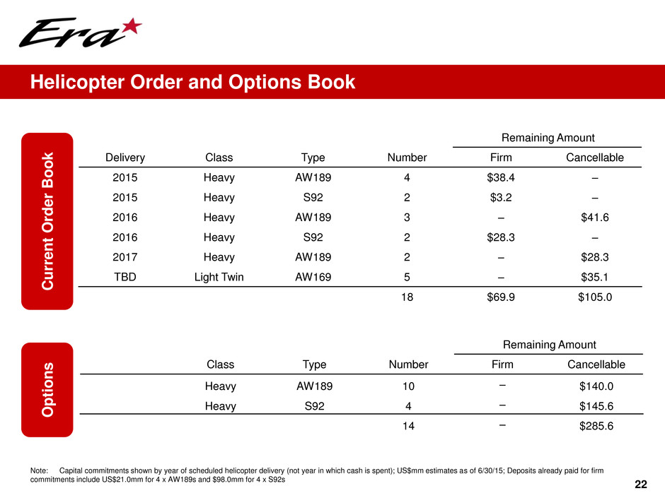 22 Cu rr ent Orde r Boo k O p tio n s Delivery Class Type Number Remaining Amount Firm Cancellable 2015 Heavy AW189 4 $38.4 – 2015 Heavy S92 2 $3.2 – 2016 Heavy AW189 3 – $41.6 2016 Heavy S92 2 $28.3 – 2017 Heavy AW189 2 – $28.3 TBD Light Twin AW169 5 – $35.1 18 $69.9 $105.0 Note: Capital commitments shown by year of scheduled helicopter delivery (not year in which cash is spent); US$mm estimates as of 6/30/15; Deposits already paid for firm commitments include US$21.0mm for 4 x AW189s and $98.0mm for 4 x S92s Class Type Number Remaining Amount Firm Cancellable Heavy AW189 10 – $140.0 Heavy S92 4 – $145.6 14 – $285.6 Helicopter Order and Options Book