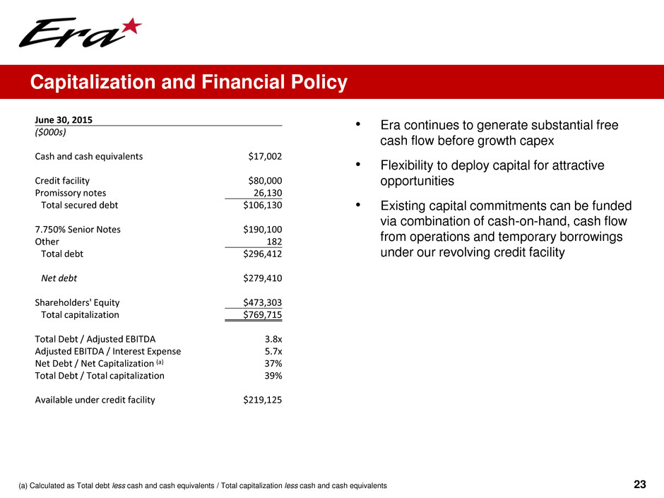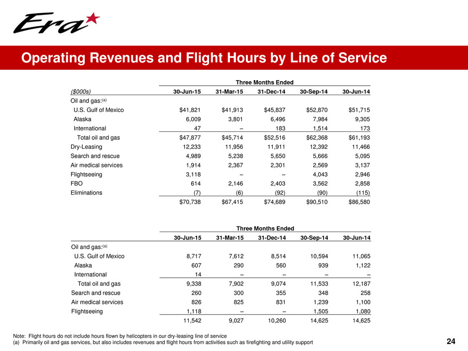 June 30, 2015 ($000s) Cash and cash equivalents $17,002 Credit facility $80,000 Promissory notes 26,130 Total secured debt $106,130 7.750% Senior Notes $190,100 Other 182 Total debt $296,412 Net debt $279,410 Shareholders' Equity $473,303 Total capitalization $769,715 Total Debt / Adjusted EBITDA 3.8x Adjusted EBITDA / Interest Expense 5.7x Net Debt / Net Capitalization (a) 37% Total Debt / Total capitalization 39% Available under credit facility $219,125 23 • Era continues to generate substantial free cash flow before growth capex • Flexibility to deploy capital for attractive opportunities • Existing capital commitments can be funded via combination of cash-on-hand, cash flow from operations and temporary borrowings under our revolving credit facility Capitalization and Financial Policy (a) Calculated as Total debt less cash and cash equivalents / Total capitalization less cash and cash equivalents