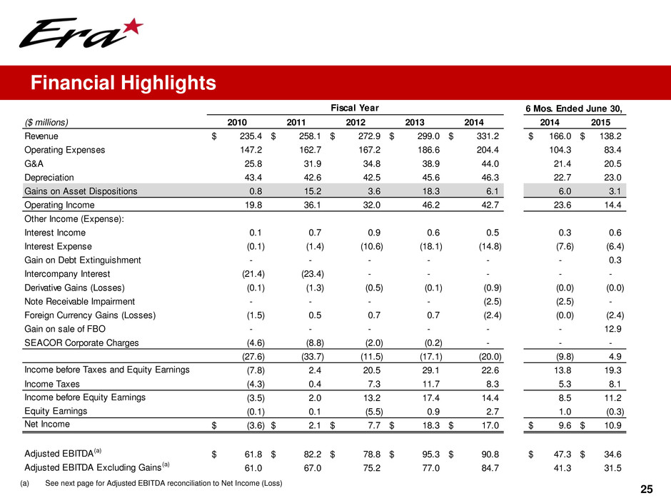 24 Operating Revenues and Flight Hours by Line of Service Note: Flight hours do not include hours flown by helicopters in our dry-leasing line of service (a) Primarily oil and gas services, but also includes revenues and flight hours from activities such as firefighting and utility support Three Months Ended ($000s) 30-Jun-15 31-Mar-15 31-Dec-14 30-Sep-14 30-Jun-14 Oil and gas:(a) U.S. Gulf of Mexico $41,821 $41,913 $45,837 $52,870 $51,715 Alaska 6,009 3,801 6,496 7,984 9,305 International 47 – 183 1,514 173 Total oil and gas $47,877 $45,714 $52,516 $62,368 $61,193 Dry-Leasing 12,233 11,956 11,911 12,392 11,466 Search and rescue 4,989 5,238 5,650 5,666 5,095 Air medical services 1,914 2,367 2,301 2,569 3,137 Flightseeing 3,118 – – 4,043 2,946 FBO 614 2,146 2,403 3,562 2,858 Eliminations (7) (6) (92) (90) (115) $70,738 $67,415 $74,689 $90,510 $86,580 Three Months Ended 30-Jun-15 31-Mar-15 31-Dec-14 30-Sep-14 30-Jun-14 Oil and gas:(a) U.S. Gulf of Mexico 8,717 7,612 8,514 10,594 11,065 Alaska 607 290 560 939 1,122 International 14 – – – – Total oil and gas 9,338 7,902 9,074 11,533 12,187 Search and rescue 260 300 355 348 258 Air medical services 826 825 831 1,239 1,100 Flightseeing 1,118 – – 1,505 1,080 11,542 9,027 10,260 14,625 14,625