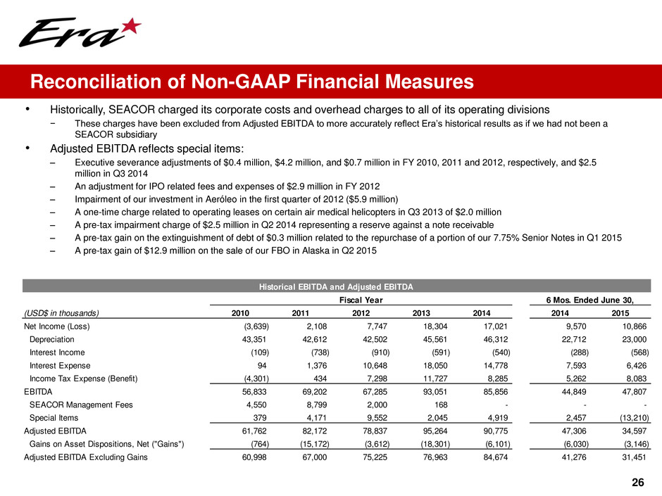 25 (a) See next page for Adjusted EBITDA reconciliation to Net Income (Loss) Financial Highlights Fiscal Year 6 Mos. Ended June 30, ($ millions) 2010 2011 2012 2013 2014 2014 2015 Revenue 235.4$ 258.1$ 272.9$ 299.0$ 331.2$ 166.0$ 138.2$ Operating Expenses 147.2 162.7 167.2 186.6 204.4 104.3 83.4 G&A 25.8 31.9 34.8 38.9 44.0 21.4 20.5 Depreciation 43.4 42.6 42.5 45.6 46.3 22.7 23.0 Gains on Asset Dispositions 0.8 15.2 3.6 18.3 6.1 6.0 3.1 Operating Income 19.8 36.1 32.0 46.2 42.7 23.6 14.4 Other Income (Expense): Interest Income 0.1 0.7 0.9 0.6 0.5 0.3 0.6 Interest Expense (0.1) (1.4) (10.6) (18.1) (14.8) (7.6) (6.4) Gain on Debt Extinguishment - - - - - - 0.3 Intercompany Interest (21.4) (23.4) - - - - - Derivative Gains (Losses) (0.1) (1.3) (0.5) (0.1) (0.9) (0.0) (0.0) Note Receivable Impairment - - - - (2.5) (2.5) - Foreign Currency Gains (Losses) (1.5) 0.5 0.7 0.7 (2.4) (0.0) (2.4) Gain on sale of FBO - - - - - - 12.9 SEACOR Corporate Charges (4.6) (8.8) (2.0) (0.2) - - - (27.6) (33.7) (11.5) (17.1) (20.0) (9.8) 4.9 Income before Taxes and Equity Earnings (7.8) 2.4 20.5 29.1 22.6 13.8 19.3 Income Taxes (4.3) 0.4 7.3 11.7 8.3 5.3 8.1 Income before Equity Earnings (3.5) 2.0 13.2 17.4 14.4 8.5 11.2 Equity Earnings (0.1) 0.1 (5.5) 0.9 2.7 1.0 (0.3) Net Income (3.6)$ 2.1$ 7.7$ 18.3$ 17.0$ 9.6$ 10.9$ Adjusted EBITDA(a) 61.8$ 82.2$ 78.8$ 95.3$ 90.8$ 47.3$ 34.6$ Adjusted EBITDA Excluding Gains (a) 61.0 67.0 75.2 77.0 84.7 41.3 31.5
