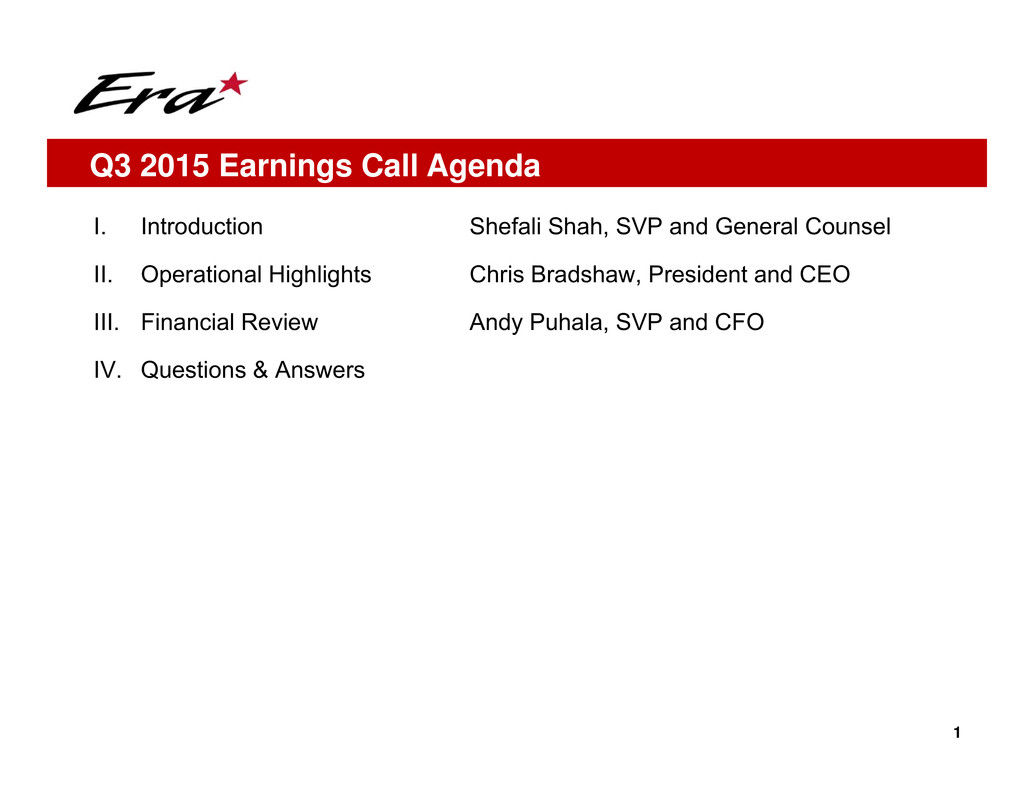 I. Introduction Shefali Shah, SVP and General Counsel II. Operational Highlights Chris Bradshaw, President and CEO III. Financial Review Andy Puhala, SVP and CFO IV. Questions & Answers Q3 2015 Earnings Call Agenda 1