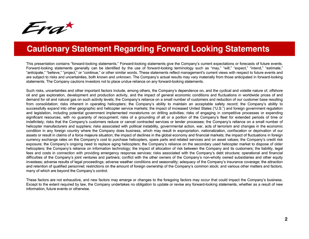 2 Cautionary Statement Regarding Forward Looking Statements This presentation contains “forward-looking statements.” Forward-looking statements give the Company’s current expectations or forecasts of future events. Forward-looking statements generally can be identified by the use of forward-looking terminology such as “may,” “will,” “expect,” “intend,” “estimate,” “anticipate,” “believe,” “project,” or “continue,” or other similar words. These statements reflect management’s current views with respect to future events and are subject to risks and uncertainties, both known and unknown. The Company’s actual results may vary materially from those anticipated in forward-looking statements. The Company cautions investors not to place undue reliance on any forward-looking statements. Such risks, uncertainties and other important factors include, among others, the Company’s dependence on, and the cyclical and volatile nature of, offshore oil and gas exploration, development and production activity, and the impact of general economic conditions and fluctuations in worldwide prices of and demand for oil and natural gas on such activity levels; the Company’s reliance on a small number of customers and reduction of our customer base resulting from consolidation; risks inherent in operating helicopters; the Company’s ability to maintain an acceptable safety record; the Company’s ability to successfully expand into other geographic and helicopter service markets; the impact of increased United States (“U.S.”) and foreign government regulation and legislation, including potential government implemented moratoriums on drilling activities; risks of engaging in competitive processes or expending significant resources, with no guaranty of recoupment; risks of a grounding of all or a portion of the Company’s fleet for extended periods of time or indefinitely; risks that the Company’s customers reduce or cancel contracted services or tender processes; the Company’s reliance on a small number of helicopter manufacturers and suppliers; risks associated with political instability, governmental action, war, acts of terrorism and changes in the economic condition in any foreign country where the Company does business, which may result in expropriation, nationalization, confiscation or deprivation of our assets or result in claims of a force majeure situation; the impact of declines in the global economy and financial markets; the impact of fluctuations in foreign currency exchange rates on the Company’s cost to purchase helicopters, spare parts and related services and on asset values; the Company’s credit risk exposure; the Company’s ongoing need to replace aging helicopters; the Company’s reliance on the secondary used helicopter market to dispose of older helicopters; the Company’s reliance on information technology; the impact of allocation of risk between the Company and its customers; the liability, legal fees and costs in connection with providing emergency response services; risks associated with the Company’s debt structure; operational and financial difficulties of the Company’s joint ventures and partners; conflict with the other owners of the Company’s non-wholly owned subsidiaries and other equity investees; adverse results of legal proceedings; adverse weather conditions and seasonality; adequacy of the Company’s insurance coverage; the attraction and retention of qualified personnel; restrictions on the amount of foreign ownership of the Company’s common stock; and various other matters and factors, many of which are beyond the Company’s control. These factors are not exhaustive, and new factors may emerge or changes to the foregoing factors may occur that could impact the Company’s business. Except to the extent required by law, the Company undertakes no obligation to update or revise any forward-looking statements, whether as a result of new information, future events or otherwise.