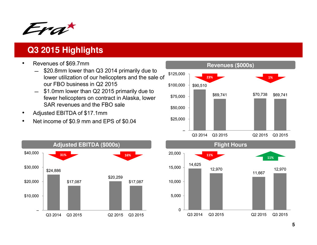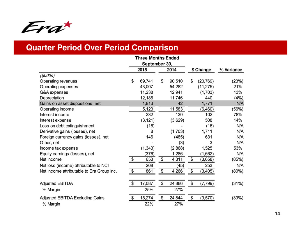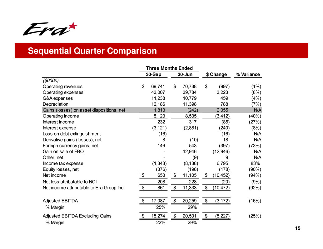 14 Quarter Period Over Period Comparison Three Months Ended September 30, 2015 2014 $ Change % Variance ($000s) Operating revenues 69,741$ 90,510$ (20,769)$ (23%) Operating expenses 43,007 54,282 (11,275) 21% G&A expenses 11,238 12,941 (1,703) 13% Depreciation 12,186 11,746 440 (4%) Gains on asset dispositions, net 1,813 42 1,771 N/A Operating income 5,123 11,583 (6,460) (56%) Interest income 232 130 102 78% Interest expense (3,121) (3,629) 508 14% Loss on debt extinguishment (16) - (16) N/A Derivative gains (losses), net 8 (1,703) 1,711 N/A Foreign currency gains (losses), net 146 (485) 631 N/A Other, net - (3) 3 N/A Income tax expense (1,343) (2,868) 1,525 53% Equity earnings (losses), net (376) 1,286 (1,662) N/A Net income 653$ 4,311$ (3,658)$ (85%) Net loss (income) attributable to NCI 208 (45) 253 N/A Net income attributable to Era Group Inc. 861$ 4,266$ (3,405)$ (80%) Adjusted EBITDA 17,087$ 24,886$ (7,799)$ (31%) % Margin 25% 27% Adjusted EBITDA Excluding Gains 15,274$ 24,844$ (9,570)$ (39%) % Margin 22% 27%