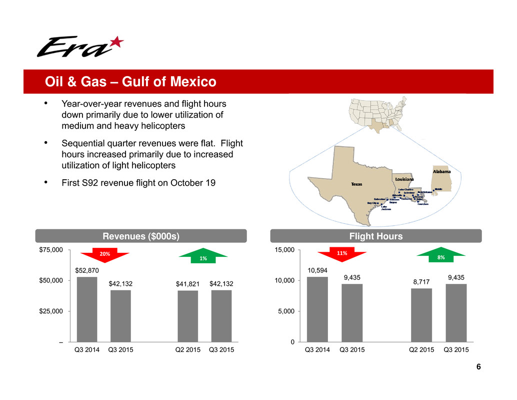 14,625 12,970 11,667 12,970 0 5,000 10,000 15,000 20,000 Q3 2014 Q3 2015 Q2 2015 Q3 2015 $90,510 $69,741 $70,738 $69,741 – $25,000 $50,000 $75,000 $100,000 $125,000 Q3 2014 Q3 2015 Q2 2015 Q3 2015 $24,886 $17,087 $20,259 $17,087 – $10,000 $20,000 $30,000 $40,000 Q3 2014 Q3 2015 Q2 2015 Q3 2015 • Revenues of $69.7mm ̶ $20.8mm lower than Q3 2014 primarily due to lower utilization of our helicopters and the sale of our FBO business in Q2 2015 ̶ $1.0mm lower than Q2 2015 primarily due to fewer helicopters on contract in Alaska, lower SAR revenues and the FBO sale • Adjusted EBITDA of $17.1mm • Net income of $0.9 mm and EPS of $0.04 5 Q3 2015 Highlights Revenues ($000s) Adjusted EBITDA ($000s) Flight Hours 23% 11% 11% 31% 1% 16%