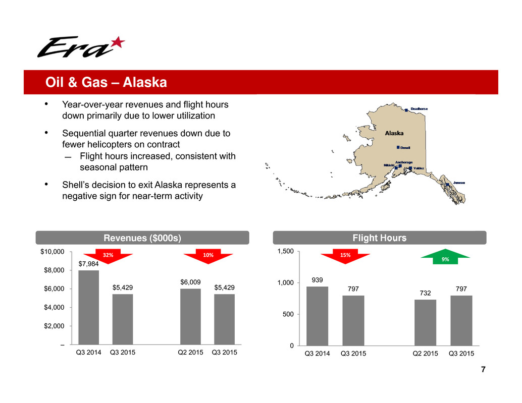 $52,870 $42,132 $41,821 $42,132 – $25,000 $50,000 $75,000 Q3 2014 Q3 2015 Q2 2015 Q3 2015 10,594 9,435 8,717 9,435 0 5,000 10,000 15,000 Q3 2014 Q3 2015 Q2 2015 Q3 2015 6 Oil & Gas – Gulf of Mexico Revenues ($000s) Flight Hours • Year-over-year revenues and flight hours down primarily due to lower utilization of medium and heavy helicopters • Sequential quarter revenues were flat. Flight hours increased primarily due to increased utilization of light helicopters • First S92 revenue flight on October 19 20% 11% 8%1%