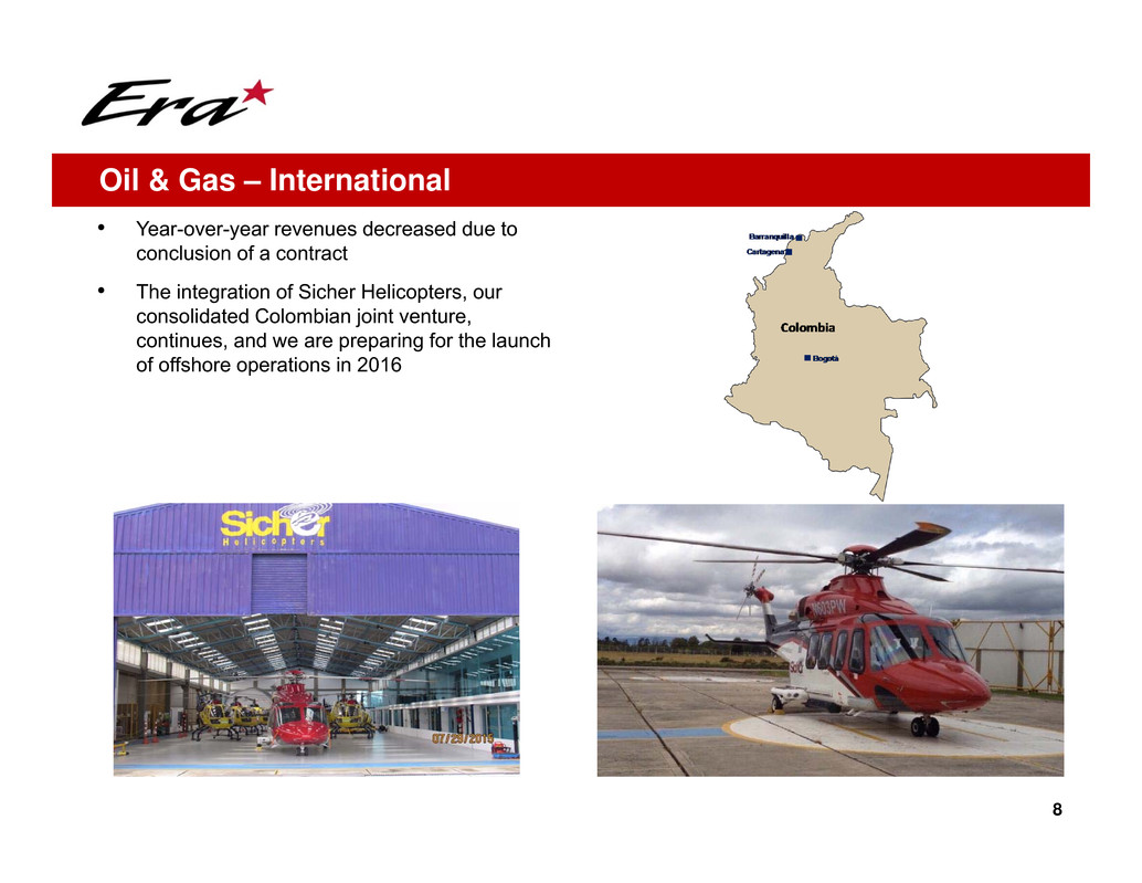 939 797 732 797 0 500 1,000 1,500 Q3 2014 Q3 2015 Q2 2015 Q3 2015 $7,984 $5,429 $6,009 $5,429 – $2,000 $4,000 $6,000 $8,000 $10,000 Q3 2014 Q3 2015 Q2 2015 Q3 2015 7 Oil & Gas – Alaska Revenues ($000s) Flight Hours 15% 9% 32% • Year-over-year revenues and flight hours down primarily due to lower utilization • Sequential quarter revenues down due to fewer helicopters on contract ̶ Flight hours increased, consistent with seasonal pattern • Shell’s decision to exit Alaska represents a negative sign for near-term activity 10%
