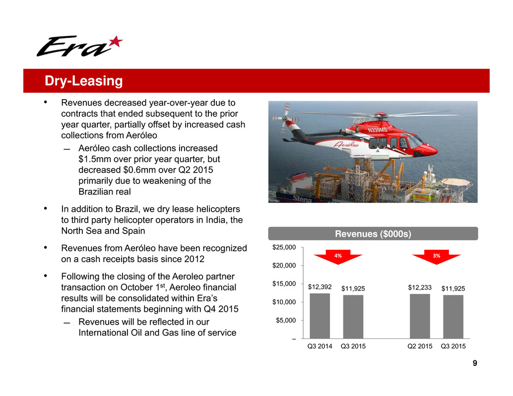 8 Oil & Gas – International • Year-over-year revenues decreased due to conclusion of a contract • The integration of Sicher Helicopters, our consolidated Colombian joint venture, continues, and we are preparing for the launch of offshore operations in 2016