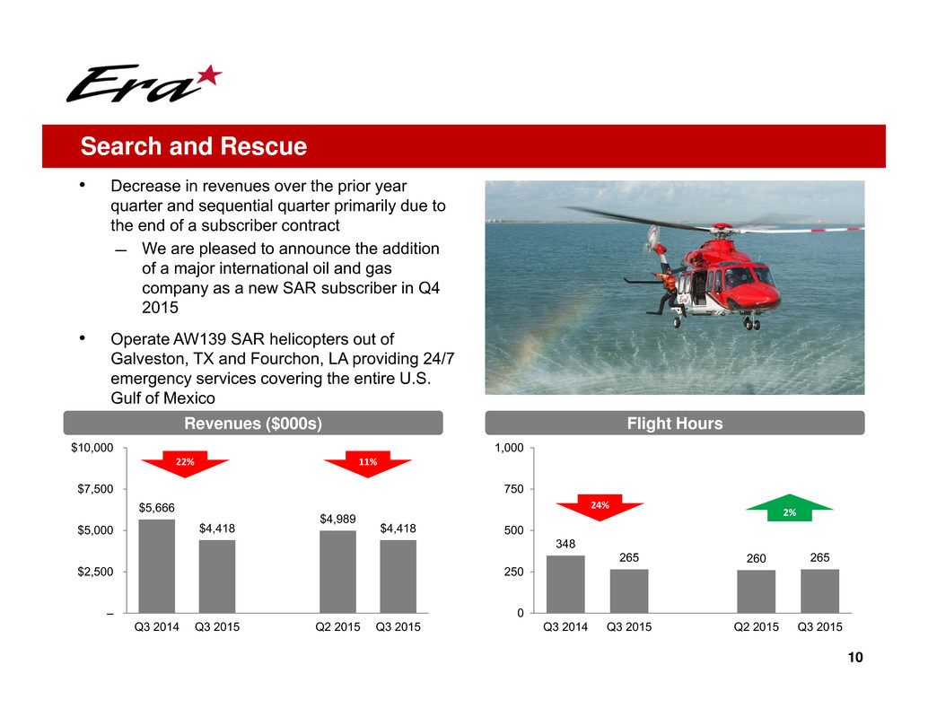 $12,392 $11,925 $12,233 $11,925 – $5,000 $10,000 $15,000 $20,000 $25,000 Q3 2014 Q3 2015 Q2 2015 Q3 2015 9 Dry-Leasing Revenues ($000s) • Revenues decreased year-over-year due to contracts that ended subsequent to the prior year quarter, partially offset by increased cash collections from Aeróleo ̶ Aeróleo cash collections increased $1.5mm over prior year quarter, but decreased $0.6mm over Q2 2015 primarily due to weakening of the Brazilian real • In addition to Brazil, we dry lease helicopters to third party helicopter operators in India, the North Sea and Spain • Revenues from Aeróleo have been recognized on a cash receipts basis since 2012 • Following the closing of the Aeroleo partner transaction on October 1st, Aeroleo financial results will be consolidated within Era’s financial statements beginning with Q4 2015 ̶ Revenues will be reflected in our International Oil and Gas line of service 4% 3%