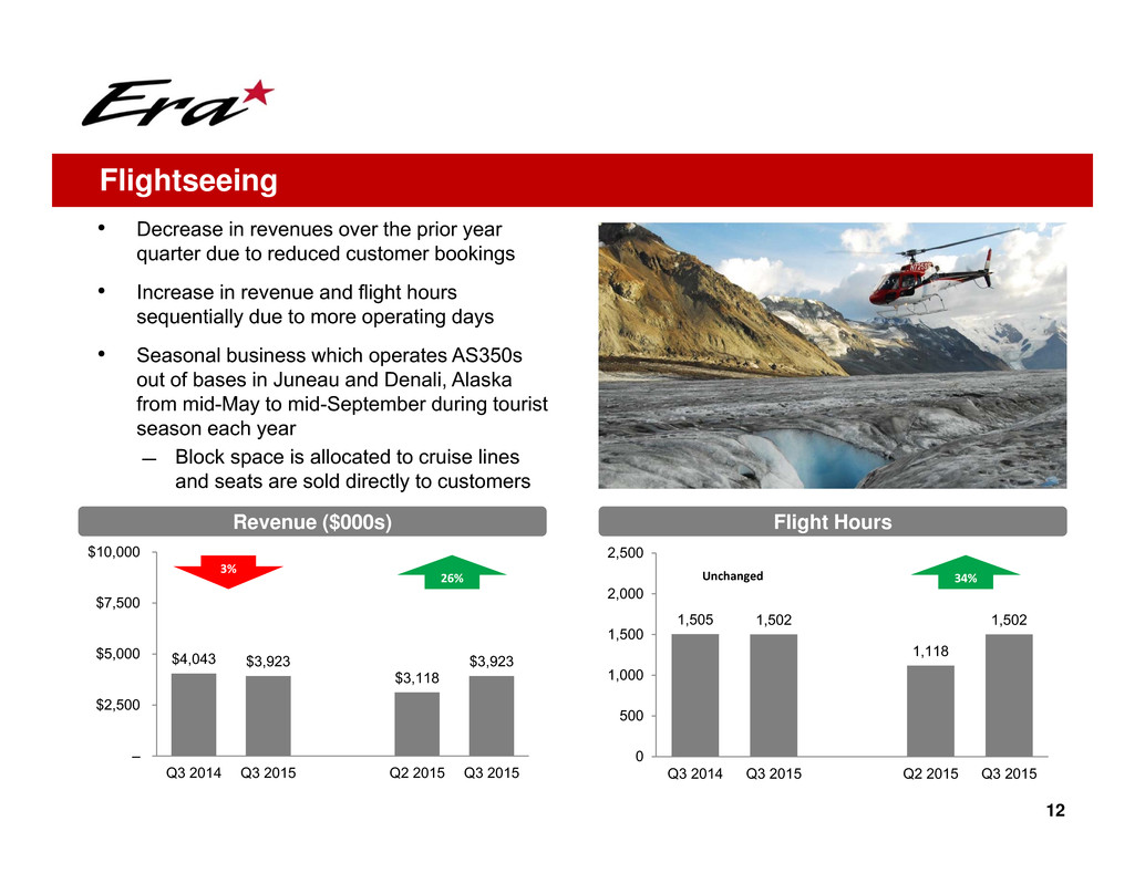 $2,569 $1,854 $1,914 $1,854 – $1,000 $2,000 $3,000 $4,000 $5,000 Q3 2014 Q3 2015 Q2 2015 Q3 2015 1,239 949 826 949 0 500 1,000 1,500 Q3 2014 Q3 2015 Q2 2015 Q3 2015 11 • Year-over-year decline in revenues and flight hours primarily due to the conclusion of a contract subsequent to the prior year quarter • Operate with a mix of helicopters owned by Era, leased-in by Era or owned by the hospitals served Air Medical Revenues ($000s) Flight Hours 23% 28% 3% 15%