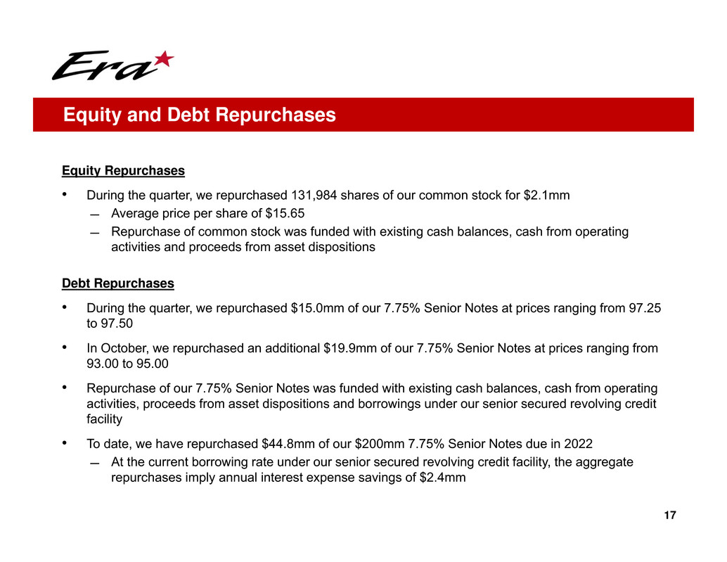 16 Year-to-date Comparison Nine Months Ended September 30, 2015 2014 $ Change % Variance ($000s) Operating revenues 207,894$ 256,533$ (48,639)$ (19%) Operating expenses 126,396 158,601 (32,205) 20% G&A expenses 31,760 34,340 (2,580) 8% Depreciation 35,186 34,458 728 (2%) Gains on asset dispositions, net 4,959 6,072 (1,113) (18%) Operating income 19,511 35,206 (15,695) (45%) Interest income 800 418 382 91% Interest expense (9,547) (11,222) 1,675 15% Gain on debt extinguishment 248 - 248 N/A Derivative losses, net (14) (1,744) 1,730 99% Note receivable impairment - (2,457) 2,457 N/A Foreign currency losses, net (2,271) (521) (1,750) (336%) Gain on sale of FBO 12,946 - 12,946 N/A Other, net (9) 10 (19) N/A Income tax expense (9,426) (8,130) (1,296) (16%) Equity earnings (losses), net (719) 2,321 (3,040) N/A Net income 11,519$ 13,881$ (2,362)$ (17%) Net loss attributable to NCI in subsidiary 633 51 582 1141% Net income attributable to Era Group Inc. 12,152$ 13,932$ (1,780)$ (13%) Adjusted EBITDA 51,684$ 72,192$ (20,508)$ (28%) % Margin 25% 28% Adjusted EBITDA Excluding Gains 46,725$ 66,120$ (19,395)$ (29%) % Margin 22% 26%