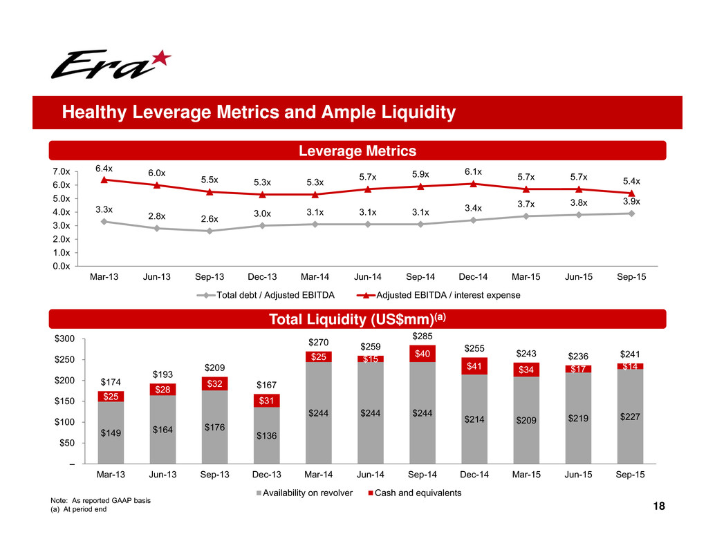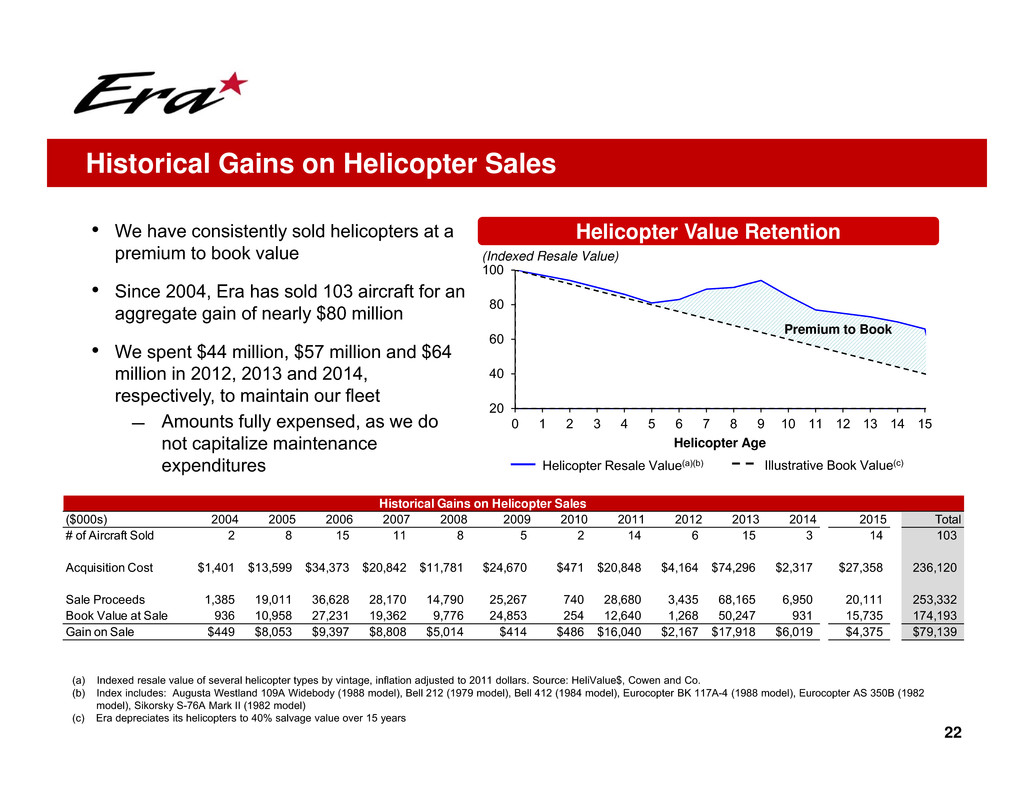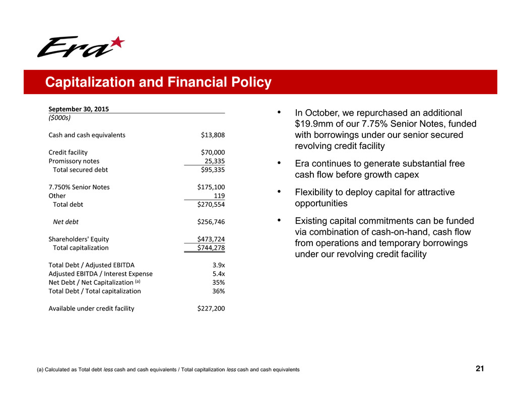 September 30, 2015 ($000s) Cash and cash equivalents $13,808 Credit facility $70,000 Promissory notes 25,335 Total secured debt $95,335 7.750% Senior Notes $175,100 Other 119 Total debt $270,554 Net debt $256,746 Shareholders' Equity $473,724 Total capitalization $744,278 Total Debt / Adjusted EBITDA 3.9x Adjusted EBITDA / Interest Expense 5.4x Net Debt / Net Capitalization (a) 35% Total Debt / Total capitalization 36% Available under credit facility $227,200 21 • In October, we repurchased an additional $19.9mm of our 7.75% Senior Notes, funded with borrowings under our senior secured revolving credit facility • Era continues to generate substantial free cash flow before growth capex • Flexibility to deploy capital for attractive opportunities • Existing capital commitments can be funded via combination of cash-on-hand, cash flow from operations and temporary borrowings under our revolving credit facility Capitalization and Financial Policy (a) Calculated as Total debt less cash and cash equivalents / Total capitalization less cash and cash equivalents