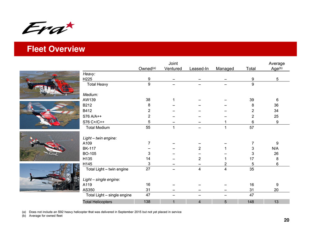 20 Owned(a) Joint Ventured Leased-In Managed Total Average Age(b) Heavy: H225 9 – – – 9 5 Total Heavy 9 – – – 9 Medium: AW139 38 1 – – 39 6 B212 8 – – – 8 36 B412 2 – – – 2 34 S76 A/A++ 2 – – – 2 25 S76 C+/C++ 5 – – 1 6 9 Total Medium 55 1 – 1 57 Light – twin engine: A109 7 – – – 7 9 BK-117 – – 2 1 3 N/A BO-105 3 – – – 3 26 H135 14 – 2 1 17 8 H145 3 – – 2 5 6 Total Light – twin engine 27 – 4 4 35 Light – single engine: A119 16 – – – 16 9 AS350 31 – – – 31 20 Total Light – single engine 47 – – – 47 Total Helicopters 138 1 4 5 148 13 (a) Does not include an S92 heavy helicopter that was delivered in September 2015 but not yet placed in service (b) Average for owned fleet Fleet Overview