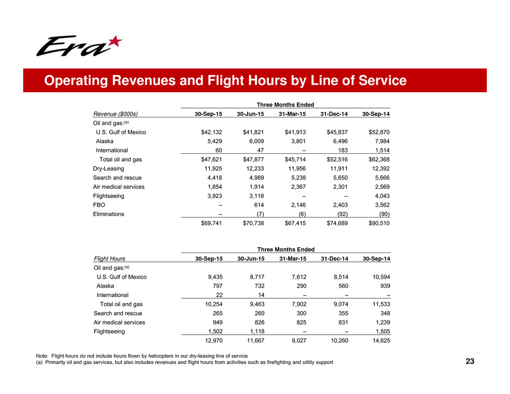 23 Operating Revenues and Flight Hours by Line of Service Note: Flight hours do not include hours flown by helicopters in our dry-leasing line of service (a) Primarily oil and gas services, but also includes revenues and flight hours from activities such as firefighting and utility support Three Months Ended Revenue ($000s) 30-Sep-15 30-Jun-15 31-Mar-15 31-Dec-14 30-Sep-14 Oil and gas:(a) U.S. Gulf of Mexico $42,132 $41,821 $41,913 $45,837 $52,870 Alaska 5,429 6,009 3,801 6,496 7,984 International 60 47 – 183 1,514 Total oil and gas $47,621 $47,877 $45,714 $52,516 $62,368 Dry-Leasing 11,925 12,233 11,956 11,911 12,392 Search and rescue 4,418 4,989 5,238 5,650 5,666 Air medical services 1,854 1,914 2,367 2,301 2,569 Flightseeing 3,923 3,118 – – 4,043 FBO – 614 2,146 2,403 3,562 Eliminations – (7) (6) (92) (90) $69,741 $70,738 $67,415 $74,689 $90,510 Three Months Ended Flight Hours 30-Sep-15 30-Jun-15 31-Mar-15 31-Dec-14 30-Sep-14 Oil and gas:(a) U.S. Gulf of Mexico 9,435 8,717 7,612 8,514 10,594 Alaska 797 732 290 560 939 International 22 14 – – – Total oil and gas 10,254 9,463 7,902 9,074 11,533 Search and rescue 265 260 300 355 348 Air medical services 949 826 825 831 1,239 Flightseeing 1,502 1,118 – – 1,505 12,970 11,667 9,027 10,260 14,625