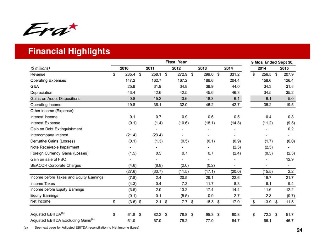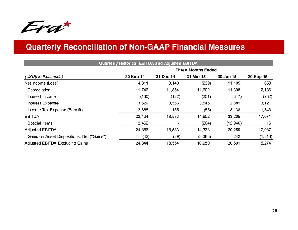 • Adjusted EBITDA reflects special items: – Executive severance adjustments of $0.4 million, $4.2 million, and $0.7 million in FY 2010, 2011 and 2012, respectively, and $2.5 million in Q3 2014 – An adjustment for IPO related fees and expenses of $2.9 million in FY 2012 – Impairment of our investment in Aeróleo in the first quarter of 2012 ($5.9 million) – A one-time charge related to operating leases on certain air medical helicopters in Q3 2013 of $2.0 million – A pre-tax impairment charge of $2.5 million in Q2 2014 representing a reserve against a note receivable – A pre-tax gain on the extinguishment of debt of $0.3 million related to the repurchase of a portion of our 7.75% Senior Notes in Q1 2015 – A pre-tax gain of $12.9 million on the sale of our FBO in Alaska in Q2 2015 – A pre-tax loss on the extinguishment of debt <$0.1 million related to the repurchase of a portion of our 7.75% Senior Notes in Q3 2015 • Historically, SEACOR charged its corporate costs and overhead charges to all of its operating divisions − These charges have been excluded from Adjusted EBITDA to more accurately reflect Era’s historical results as if we had not been a SEACOR subsidiary 25 Reconciliation of Non-GAAP Financial Measures Historical EBITDA and Adjusted EBITDA Fiscal Year 9 Mos. Ended Sept 30, (USD$ in thousands) 2010 2011 2012 2013 2014 2014 2015 Net Income (Loss) (3,639) 2,108 7,747 18,304 17,021 13,881 11,519 Depreciation 43,351 42,612 42,502 45,561 46,312 34,458 35,186 Interest Income (109) (738) (910) (591) (540) (418) (800) Interest Expense 94 1,376 10,648 18,050 14,778 11,222 9,547 Interest Expense on Advances 21,437 23,410 - - - - - Income Tax Expense (Benefit) (4,301) 434 7,298 11,727 8,285 8,130 9,426 EBITDA 56,833 69,202 67,285 93,051 85,856 67,273 64,878 SEACOR Management Fees 4,550 8,799 2,000 168 - - - Special Items 379 4,171 9,552 2,045 4,919 4,919 (13,194) Adjusted EBITDA 61,762 82,172 78,837 95,264 90,775 72,192 51,684 Gains on Asset Dispositions, Net ("Gains") (764) (15,172) (3,612) (18,301) (6,101) (6,072) (4,959) Adjusted EBITDA Excluding Gains 60,998 67,000 75,225 76,963 84,674 66,120 46,725