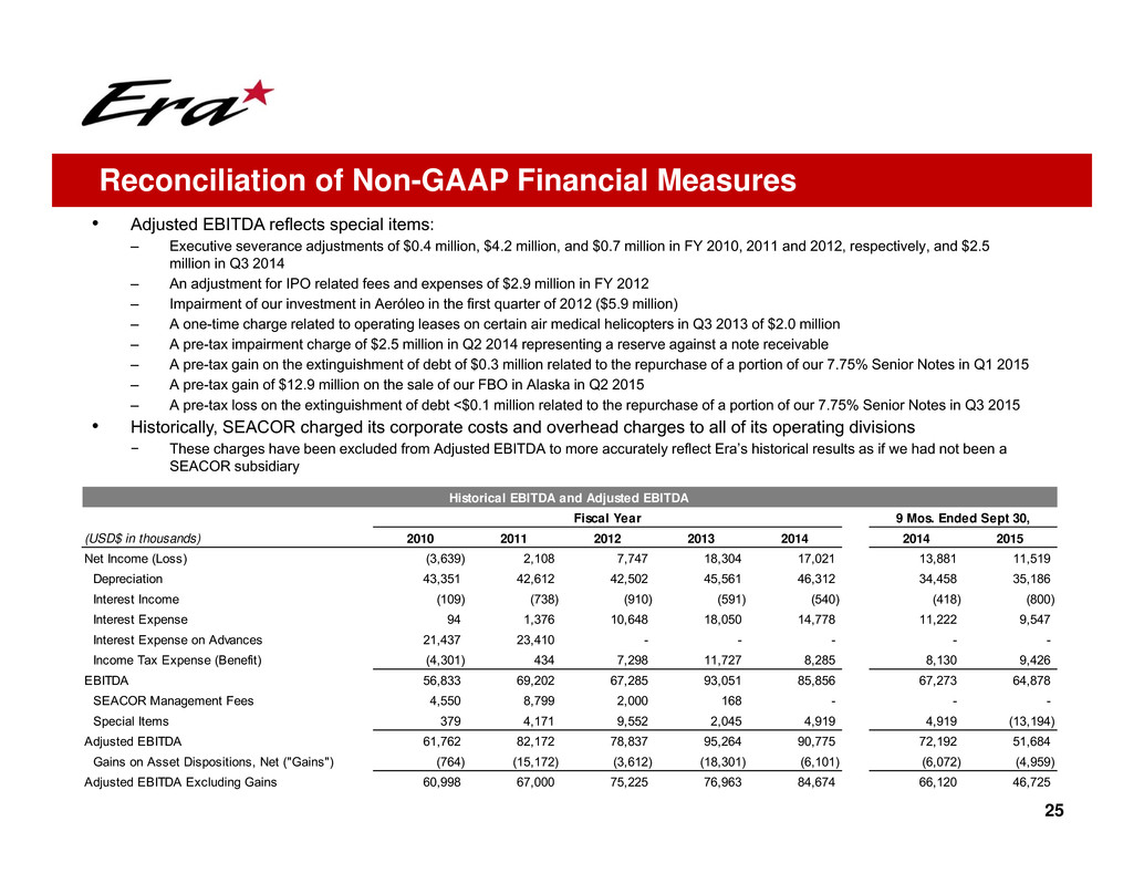 24 (a) See next page for Adjusted EBITDA reconciliation to Net Income (Loss) Financial Highlights Fiscal Year 9 Mos. Ended Sept 30, ($ millions) 2010 2011 2012 2013 2014 2014 2015 Revenue 235.4$ 258.1$ 272.9$ 299.0$ 331.2$ 256.5$ 207.9$ Operating Expenses 147.2 162.7 167.2 186.6 204.4 158.6 126.4 G&A 25.8 31.9 34.8 38.9 44.0 34.3 31.8 Depreciation 43.4 42.6 42.5 45.6 46.3 34.5 35.2 Gains on Asset Dispositions 0.8 15.2 3.6 18.3 6.1 6.1 5.0 Operating Income 19.8 36.1 32.0 46.2 42.7 35.2 19.5 Other Income (Expense): Interest Income 0.1 0.7 0.9 0.6 0.5 0.4 0.8 Interest Expense (0.1) (1.4) (10.6) (18.1) (14.8) (11.2) (9.5) Gain on Debt Extinguishment - - - - - - 0.2 Intercompany Interest (21.4) (23.4) - - - - - Derivative Gains (Losses) (0.1) (1.3) (0.5) (0.1) (0.9) (1.7) (0.0) Note Receivable Impairment - - - - (2.5) (2.5) - Foreign Currency Gains (Losses) (1.5) 0.5 0.7 0.7 (2.4) (0.5) (2.3) Gain on sale of FBO - - - - - - 12.9 SEACOR Corporate Charges (4.6) (8.8) (2.0) (0.2) - - - (27.6) (33.7) (11.5) (17.1) (20.0) (15.5) 2.2 Income before Taxes and Equity Earnings (7.8) 2.4 20.5 29.1 22.6 19.7 21.7 Income Taxes (4.3) 0.4 7.3 11.7 8.3 8.1 9.4 Income before Equity Earnings (3.5) 2.0 13.2 17.4 14.4 11.6 12.2 Equity Earnings (0.1) 0.1 (5.5) 0.9 2.7 2.3 (0.7) Net Income (3.6)$ 2.1$ 7.7$ 18.3$ 17.0$ 13.9$ 11.5$ Adjusted EBITDA(a) 61.8$ 82.2$ 78.8$ 95.3$ 90.8$ 72.2$ 51.7$ Adjusted EBITDA Excluding Gains(a) 61.0 67.0 75.2 77.0 84.7 66.1 46.7