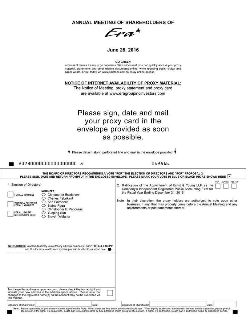 aNNUal mEETiNG Of shaREhOldERs OfERa GROUp iNc. June 28, 2016 NOTicE Of iNTERNET availaBiliTY Of pROXY maTERial: The Notice of Meeting, proxy statement and proxy card are available at www.eragroupincinvestors.com Please sign, date and mailyour proxy card in theenvelope provided as soonas possible. Signature of Shareholder Date: Signature of Shareholder Date:Note: Please sign exactly as your name or names appear on this Proxy. When shares are held jointly, each holder should sign. When signing as executor, administrator, attorney, trustee or guardian, please give fulltitle as such. If the signer is a corporation, please sign full corporate name by duly authorized officer, giving full title as such. If signer is a partnership, please sign in partnership name by authorized person. To change the address on your account, please check the box at right andindicate your new address in the address space above. Please note thatchanges to the registered name(s) on the account may not be submitted viathis method. 1. Election of Directors: O Christopher BradshawO Charles FabrikantO Ann FairbanksO Blaine FoggO Christopher P. PapourasO Yueping SunO Steven Webster 2. Ratification of the Appointment of Ernst & Young LLP as theCompany's Independent Registered Public Accounting Firm forthe Fiscal Year Ending December 31, 2016. Note In their discretion, the proxy holders are authorized to vote upon other business, if any, that may properly come before the Annual Meeting and anyadjournments or postponements thereof. FOR AGAINST ABSTAIN FOR ALL NOMINEES WITHHOLD AUTHORITY FOR ALL NOMINEES FOR ALL EXCEPT(See instructions below) INSTRUCTIONS: To withhold authority to vote for any individual nominee(s), mark “FOR ALL EXCEPT”and fill in the circle next to each nominee you wish to withhold, as shown here: NOmiNEEs: ThE BOaRd Of diREcTORs REcOmmENds a vOTE "fOR" ThE ElEcTiON Of diREcTORs aNd "fOR" pROpOsal 2.plEasE siGN, daTE aNd RETURN pROmpTlY iN ThE ENclOsEd ENvElOpE. plEasE maRK YOUR vOTE iN BlUE OR BlacK iNK as shOWN hERE x Please detach along perforated line and mail in the envelope provided.------------------ ---------------- 20730000000000000000 5 062816 GO GREENe-Consent makes it easy to go paperless. With e-Consent, you can quickly access your proxymaterial, statements and other eligible documents online, while reducing costs, clutter andpaper waste. Enroll today via www.amstock.com to enjoy online access.