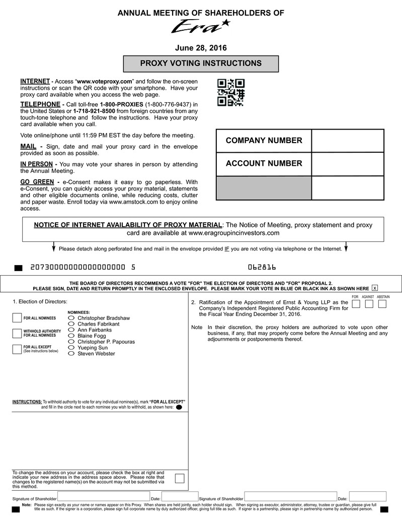 Signature of Shareholder Date: Signature of Shareholder Date:Note: Please sign exactly as your name or names appear on this Proxy. When shares are held jointly, each holder should sign. When signing as executor, administrator, attorney, trustee or guardian, please give fulltitle as such. If the signer is a corporation, please sign full corporate name by duly authorized officer, giving full title as such. If signer is a partnership, please sign in partnership name by authorized person. To change the address on your account, please check the box at right andindicate your new address in the address space above. Please note thatchanges to the registered name(s) on the account may not be submitted viathis method. INSTRUCTIONS: To withhold authority to vote for any individual nominee(s), mark “FOR ALL EXCEPT”and fill in the circle next to each nominee you wish to withhold, as shown here: JOhN smiTh1234 maiN sTREETapT. 203NEW YORK, NY 10038 aNNUal mEETiNG Of shaREhOldERs Of June 28, 2016 iNTERNET - Access “www.voteproxy.com” and follow the on-screeninstructions or scan the QR code with your smartphone. Have yourproxy card available when you access the web page.TElEphONE - Call toll-free 1-800-pROXiEs (1-800-776-9437) inthe United States or 1-718-921-8500 from foreign countries from anytouch-tone telephone and follow the instructions. Have your proxycard available when you call.Vote online/phone until 11:59 PM EST the day before the meeting. mail - Sign, date and mail your proxy card in the envelopeprovided as soon as possible.iN pERsON - You may vote your shares in person by attendingthe Annual Meeting.GO GREEN - e-Consent makes it easy to go paperless. Withe-Consent, you can quickly access your proxy material, statementsand other eligible documents online, while reducing costs, clutterand paper waste. Enroll today via www.amstock.com to enjoy onlineaccess. pROXY vOTiNG iNsTRUcTiONs Please detach along perforated line and mail in the envelope provided IF you are not voting via telephone or the Internet. ThE BOaRd Of diREcTORs REcOmmENds a vOTE "fOR" ThE ElEcTiON Of diREcTORs aNd "fOR" pROpOsal 2.plEasE siGN, daTE aNd RETURN pROmpTlY iN ThE ENclOsEd ENvElOpE. plEasE maRK YOUR vOTE iN BlUE OR BlacK iNK as shOWN hERE x ------------------ ---------------- cOmpaNY NUmBER accOUNT NUmBER NOTicE Of iNTERNET availaBiliTY Of pROXY maTERial: The Notice of Meeting, proxy statement and proxycard are available at www.eragroupincinvestors.com 1. Election of Directors: O Christopher BradshawO Charles FabrikantO Ann FairbanksO Blaine FoggO Christopher P. PapourasO Yueping SunO Steven Webster 2. Ratification of the Appointment of Ernst & Young LLP as theCompany's Independent Registered Public Accounting Firm forthe Fiscal Year Ending December 31, 2016. Note In their discretion, the proxy holders are authorized to vote upon other business, if any, that may properly come before the Annual Meeting and anyadjournments or postponements thereof. FOR AGAINST ABSTAIN FOR ALL NOMINEES WITHHOLD AUTHORITY FOR ALL NOMINEES FOR ALL EXCEPT(See instructions below) NOmiNEEs: 20730000000000000000 5 062816