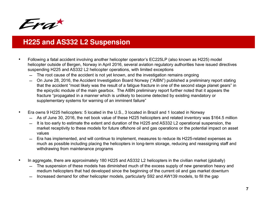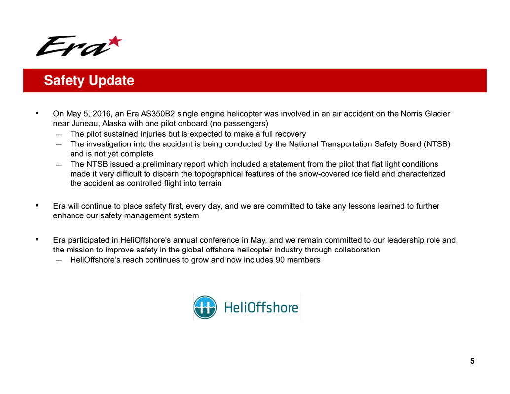 • Era participated in HeliOffshore’s annual conference in May, and we remain committed to our leadership role and