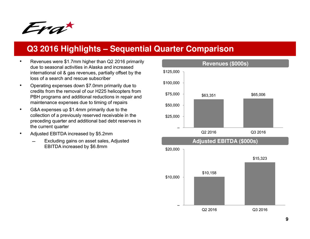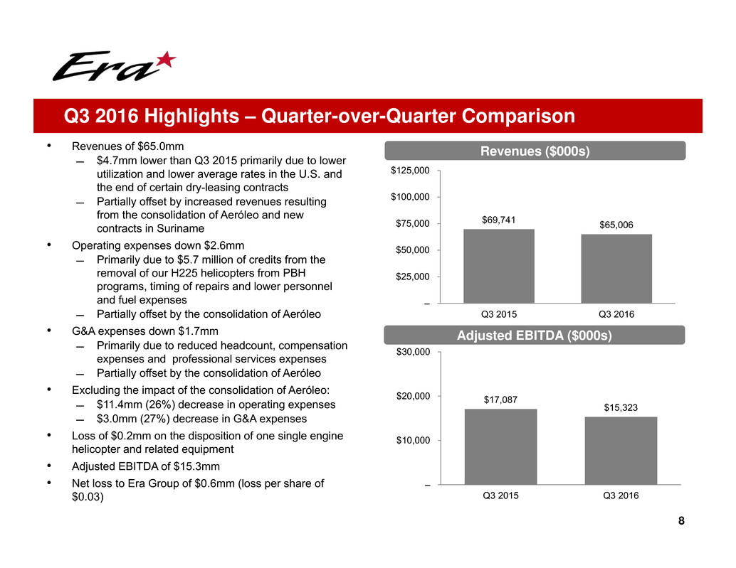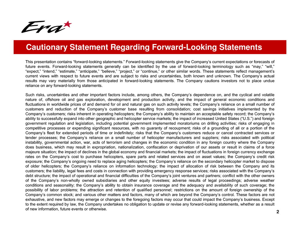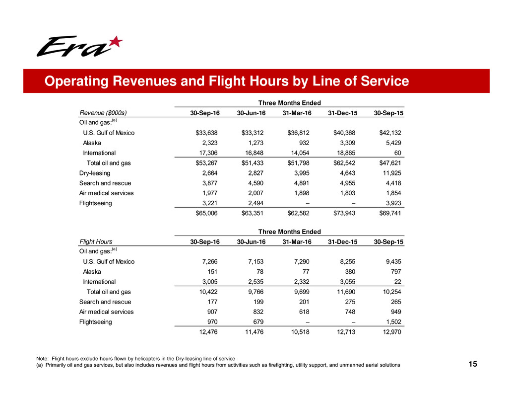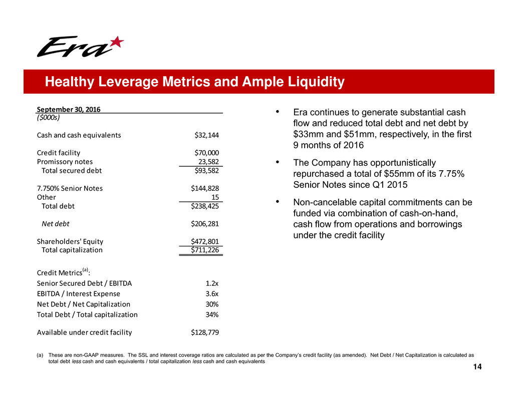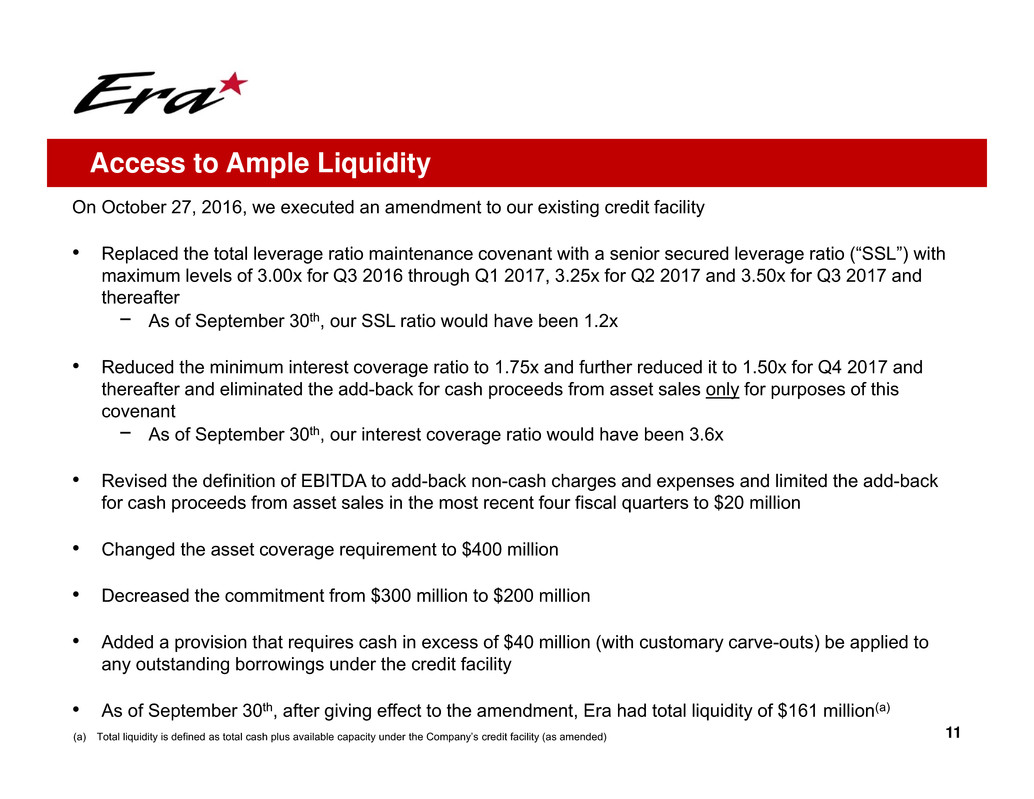 • In October, Era’s revolving credit facility was amended to allow the Company to maintain access to liquidity and enhance