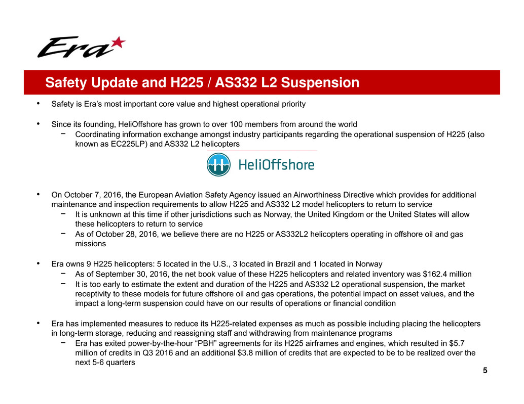 • Era has implemented measures to reduce its H225-related expenses as much as possible including placing the helicopters