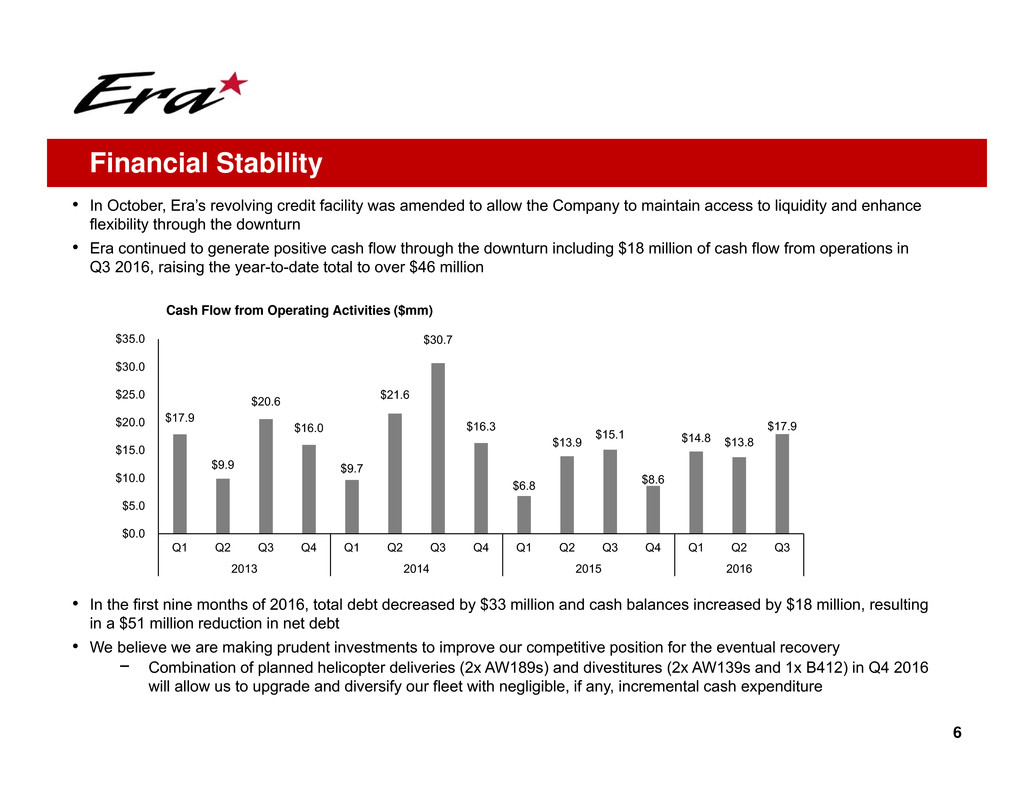 • Era continued to generate positive cash flow through the downturn including $18 million of cash flow from operations in