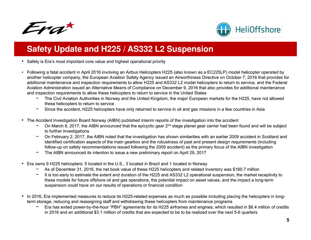 • In 2016, Era implemented measures to reduce its H225-related expenses as much as possible including placing the helicopters in long-