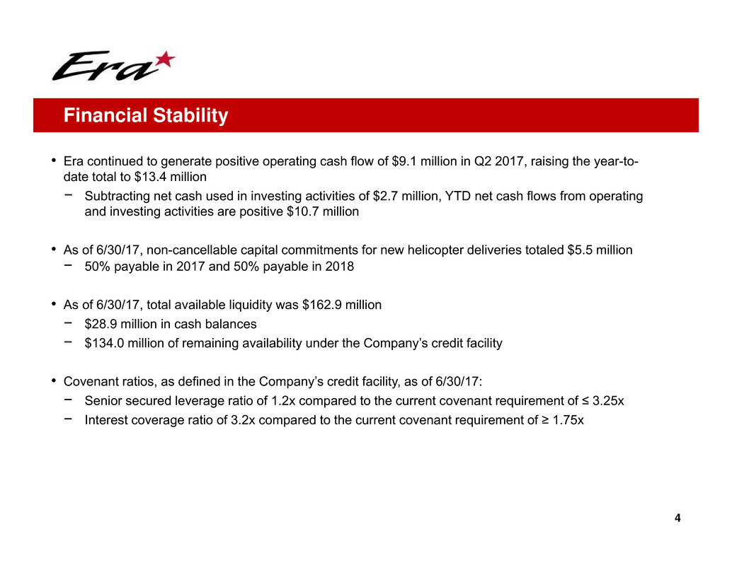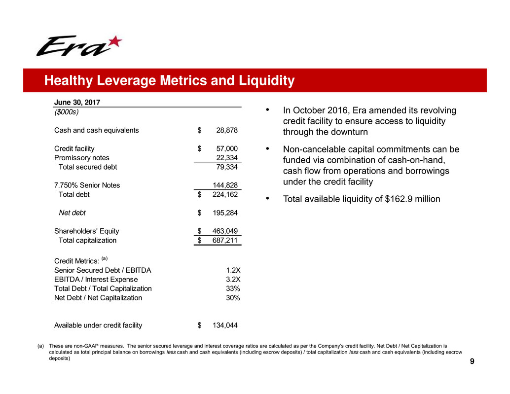 • Era continued to generate positive operating cash flow of $9.1 million in Q2 2017, raising the year-to-