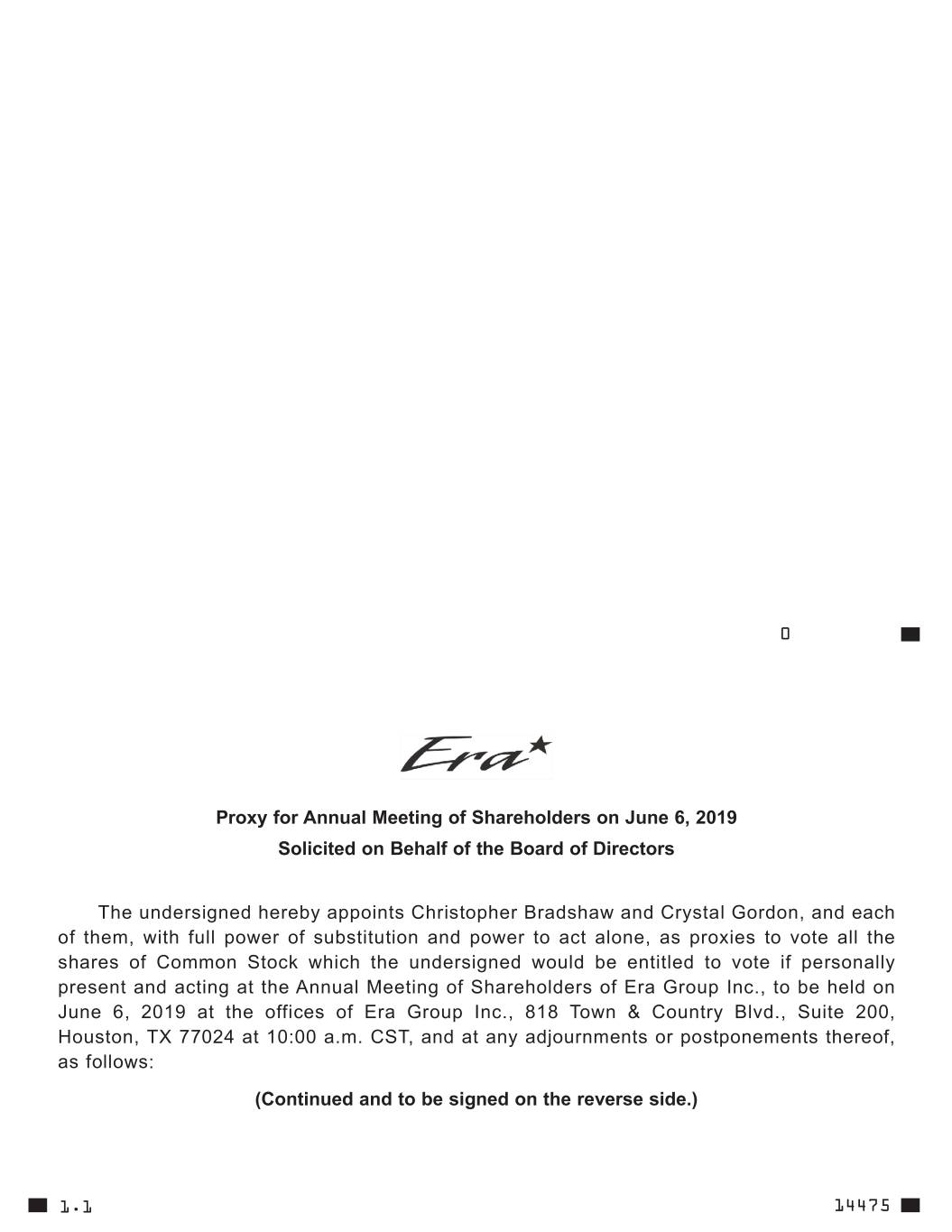 ------------------ . . . . . . . . . . . . . . . . . . . . . . . . . . . . . . . . . . . . . . . . . . . . . . . . . . . . . . ---------------- 0 Proxy for Annual Meeting of Shareholders on June 6, 2019 Solicited on Behalf of the Board of Directors The undersigned hereby appoints Christopher Bradshaw and Crystal Gordon, and each of t hem, w ith f ull p ower o f s ubstitution a nd p ower t o a ct a lone, a s p roxies t o v ote a ll t he shares o f C ommon S tock w hich t he u ndersigned w ould b e e ntitled t o v ote i f p ersonally present and acting at the Annual Meeting of Shareholders of Era Group Inc., to be held on June 6, 2019 at the offices of Era Group Inc., 818 Town & Country Blvd., Suite 200, Houston, TX 77024 at 10:00 a.m. CST, and at any adjournments or postponements thereof, as follows: (Continued and to be signed on the reverse side.) 1.1 14475