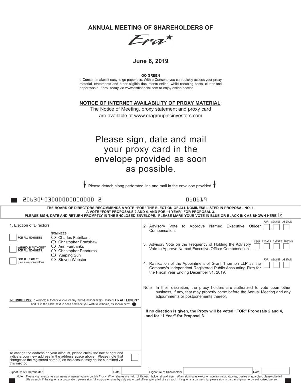 ANNUAL MEETING OF SHAREHOLDERS OF ERA GROUP INC. June 6, 2019 GO GREEN e-Consent makes it easy to go paperless. With e-Consent, you can quickly access your proxy material, statements and other eligible documents online, while reducing costs, clutter and paper waste. Enroll today via www.astfinancial.com to enjoy online access. NOTICE OF INTERNET AVAILABILITY OF PROXY MATERIAL : The Notice of Meeting, proxy statement and proxy card are available at www.eragroupincinvestors.com Please sign, date and mail your proxy card in the envelope provided as soon as possible. Please detach along perforated line and mail in the envelope provided. ------------------ ---------------- 20630403000000000000 2 060619 THE BOARD OF DIRECTORS RECOMMENDS A VOTE “FOR” THE ELECTION OF ALL NOMINESS LISTED IN PROPOSAL NO. 1, A VOTE “FOR” PROPOSALS 2 AND 4, AND FOR “1 YEAR” FOR PROPOSAL 3. PLEASE SIGN, DATE AND RETURN PROMPTLY IN THE ENCLOSED ENVELOPE. PLEASE MARK YOUR VOTE IN BLUE OR BLACK INK AS SHOWN HERE x FOR AGAINST ABSTAIN 1. Election of Directors: 2. Advisory Vote to Approve Named Executive Ofiicer Compensation. NOMINEES: FOR ALL NOMINEES O Charles Fabrikant O Christopher Bradshaw 1 YEAR 2 YEARS 3 YEARS ABSTAIN 3. Advisory Vote on the Frequency of Holding the Advisory WITHH OLD AUTHORITY O Ann Fairbanks Vote to Approve Named Executive Officer Compensation. FOR ALL NOMINEES O Christopher Papouras O Yueping Sun FOR ALL EXCEPT O Steven Webster FOR AGAINST ABSTAIN (See instructions below) 4. Ratification of the Appointment of Grant T hornton LLP as the Company's Independent Registered Public Accounting Firm for the Fiscal Year Ending December 31, 2019. Note In their discretion, the proxy holders are authorized to vote upon other business, if any, that may properly come before the Annual Meeting and any adjournments or postponements thereof. INSTRUCTIONS: To withhold authority to vote for any individual nominee(s), mark “FOR ALL EXCEPT ” and fill in the circle next to each nominee you wish to withhold, as shown here: If no direction is given, the Proxy will be voted “FOR” Proposals 2 and 4, and for “1 Year” for Proposal 3. To change the address on your account, please check the box at right and indicate your new address in the address space above. Please note that changes to the registered name(s) on the account may not be submitted via this method. Signature of Shareholder Date: Signature of Shareholder Date: Note: Please sign exactly as your name or names appear on this Proxy. When shares are held jointly, each holder should sign. When signing as executor, administrator, attorney, trustee or guardian, please give full title as such. If the signer is a corporation, please sign full corporate name by duly authorized officer, giving full title as such. If signer is a partnership, please sign in partnership name by authorized person.
