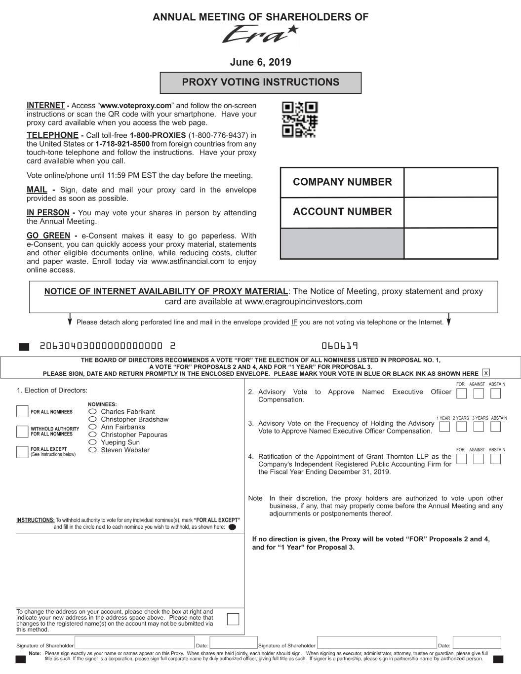 ANNUAL MEETING OF SHAREHOLDERS OF June 6, 2019 PROXY VOTING INSTRUCTIONS INTERNET - Access “ www.voteproxy.com ” and follow the on-screen instructions or scan the QR code with your smartphone. Have your proxy card available when you access the web page. TELEPHONE - Call toll-free 1-800-PROXIES (1-800-776-9437) in the United States or 1-718-921-8500 from foreign countries from any touch-tone telephone and follow the instructions. Have your proxy card available when you call. Vote online/phone until 11:59 PM EST the day before the meeting. COMPANY NUMBER MAIL - Sign, date and mail your proxy card in the envelope provided as soon as possible. IN PERSON - You may vote your shares in person by attending ACCOUNT NUMBER the Annual Meeting. GO GREEN - e-Consent makes it easy to go paperless. With e-Consent, you can quickly access your proxy material, statements and other eligible documents online, while reducing costs, clutter and paper waste. Enroll today via www.astfinancial.com to enjoy online access. NOTICE OF INTERNET AVAILABILITY OF PROXY MATERIAL : The Notice of Meeting, proxy statement and proxy card are available at www.eragroupincinvestors.com Please detach along perforated line and mail in the envelope provided IF you are not voting via telephone or the Internet. ------------------ ---------------- 20630403000000000000 2 060619 THE BOARD OF DIRECTORS RECOMMENDS A VOTE “FOR” THE ELECTION OF ALL NOMINESS LISTED IN PROPOSAL NO. 1, A VOTE “FOR” PROPOSALS 2 AND 4, AND FOR “1 YEAR” FOR PROPOSAL 3. PLEASE SIGN, DATE AND RETURN PROMPTLY IN THE ENCLOSED ENVELOPE. PLEASE MARK YOUR VOTE IN BLUE OR BLACK INK AS SHOWN HERE x FOR AGAINST ABSTAIN 1. Election of Directors: 2. Advisory Vote to Approve Named Executive Ofiicer Compensation. NOMINEES: FOR ALL NOMINEES O Charles Fabrikant O Christopher Bradshaw 1 YEAR 2 YEARS 3 YEARS ABSTAIN 3. Advisory Vote on the Frequency of Holding the Advisory WITHH OLD AUTHORITY O Ann Fairbanks Vote to Approve Named Executive Officer Compensation. FOR ALL NOMINEES O Christopher Papouras O Yueping Sun FOR ALL EXCEPT O Steven Webster FOR AGAINST ABSTAIN (See instructions below) 4. Ratification of the Appointment of Grant T hornton LLP as the Company's Independent Registered Public Accounting Firm for the Fiscal Year Ending December 31, 2019. Note In their discretion, the proxy holders are authorized to vote upon other business, if any, that may properly come before the Annual Meeting and any adjournments or postponements thereof. INSTRUCTIONS: To withhold authority to vote for any individual nominee(s), mark “FOR ALL EXCEPT ” and fill in the circle next to each nominee you wish to withhold, as shown here: If no direction is given, the Proxy will be voted “FOR” Proposals 2 and 4, and for “1 Year” for Proposal 3. JOHN SMITH 1234 MAIN STREET APT. 203 NEW YORK, NY 10038 To change the address on your account, please check the box at right and indicate your new address in the address space above. Please note that changes to the registered name(s) on the account may not be submitted via this method. Signature of Shareholder Date: Signature of Shareholder Date: Note: Please sign exactly as your name or names appear on this Proxy. When shares are held jointly, each holder should sign. When signing as executor, administrator, attorney, trustee or guardian, please give full title as such. If the signer is a corporation, please sign full corporate name by duly authorized officer, giving full title as such. If signer is a partnership, please sign in partnership name by authorized person.