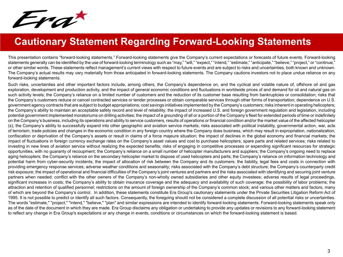 Cautionary Statement Regarding Forward-Looking Statements This presentation contains “forward-looking statements.” Forward-looking statements give the Company’s current expectations or forecasts of future events. Forward-looking statements generally can be identified by the use of forward-looking terminology such as “may,” “will,” “expect,” “intend,” “estimate,” “anticipate,” “believe,” “project,” or “continue,” or other similar words. These statements reflect management’s current views with respect to future events and are subject to risks and uncertainties, both known and unknown. The Company’s actual results may vary materially from those anticipated in forward-looking statements. The Company cautions investors not to place undue reliance on any forward-looking statements. Such risks, uncertainties and other important factors include, among others, the Company’s dependence on, and the cyclical and volatile nature of, offshore oil and gas exploration, development and production activity, and the impact of general economic conditions and fluctuations in worldwide prices of and demand for oil and natural gas on such activity levels; the Company’s reliance on a limited number of customers and the reduction of its customer base resulting from bankruptcies or consolidation; risks that the Company’s customers reduce or cancel contracted services or tender processes or obtain comparable services through other forms of transportation; dependence on U.S. government agency contracts that are subject to budget appropriations; cost savings initiatives implemented by the Company’s customers; risks inherent in operating helicopters; the Company’s ability to maintain an acceptable safety record and level of reliability; the impact of increased U.S. and foreign government regulation and legislation, including potential government implemented moratoriums on drilling activities; the impact of a grounding of all or a portion of the Company’s fleet for extended periods of time or indefinitely on the Company’s business, including its operations and ability to service customers, results of operations or financial condition and/or the market value of the affected helicopter (s); the Company’s ability to successfully expand into other geographic and aviation service markets; risks associated with political instability, governmental action, war, acts of terrorism, trade policies and changes in the economic condition in any foreign country where the Company does business, which may result in expropriation, nationalization, confiscation or deprivation of the Company’s assets or result in claims of a force majeure situation; the impact of declines in the global economy and financial markets; the impact of fluctuations in foreign currency exchange rates on the Company’s asset values and cost to purchase helicopters, spare parts and related services; risks related to investing in new lines of aviation service without realizing the expected benefits; risks of engaging in competitive processes or expending significant resources for strategic opportunities, with no guaranty of recoupment; the Company’s reliance on a small number of helicopter manufacturers and suppliers; the Company’s ongoing need to replace aging helicopters; the Company’s reliance on the secondary helicopter market to dispose of used helicopters and parts; the Company’s reliance on information technology and potential harm from cyber-security incidents; the impact of allocation of risk between the Company and its customers; the liability, legal fees and costs in connection with providing emergency response services; adverse weather conditions and seasonality; risks associated with the Company’s debt structure; the Company’s counterparty credit risk exposure; the impact of operational and financial difficulties of the Company’s joint ventures and partners and the risks associated with identifying and securing joint venture partners when needed; conflict with the other owners of the Company’s non-wholly owned subsidiaries and other equity investees; adverse results of legal proceedings, significant increases in costs; the Company’s ability to obtain insurance coverage and the adequacy and availability of such coverage; the possibility of labor problems; the attraction and retention of qualified personnel; restrictions on the amount of foreign ownership of the Company’s common stock; and various other matters and factors, many of which are beyond the Company’s control. In addition, these statements constitute Era Group's cautionary statements under the Private Securities Litigation Reform Act of 1995. It is not possible to predict or identify all such factors. Consequently, the foregoing should not be considered a complete discussion of all potential risks or uncertainties. The words "estimate," "project," "intend," "believe," "plan" and similar expressions are intended to identify forward-looking statements. Forward-looking statements speak only as of the date of the document in which they are made. Era Group disclaims any obligation or undertaking to provide any updates or revisions to any forward-looking statement to reflect any change in Era Group's expectations or any change in events, conditions or circumstances on which the forward-looking statement is based. 3