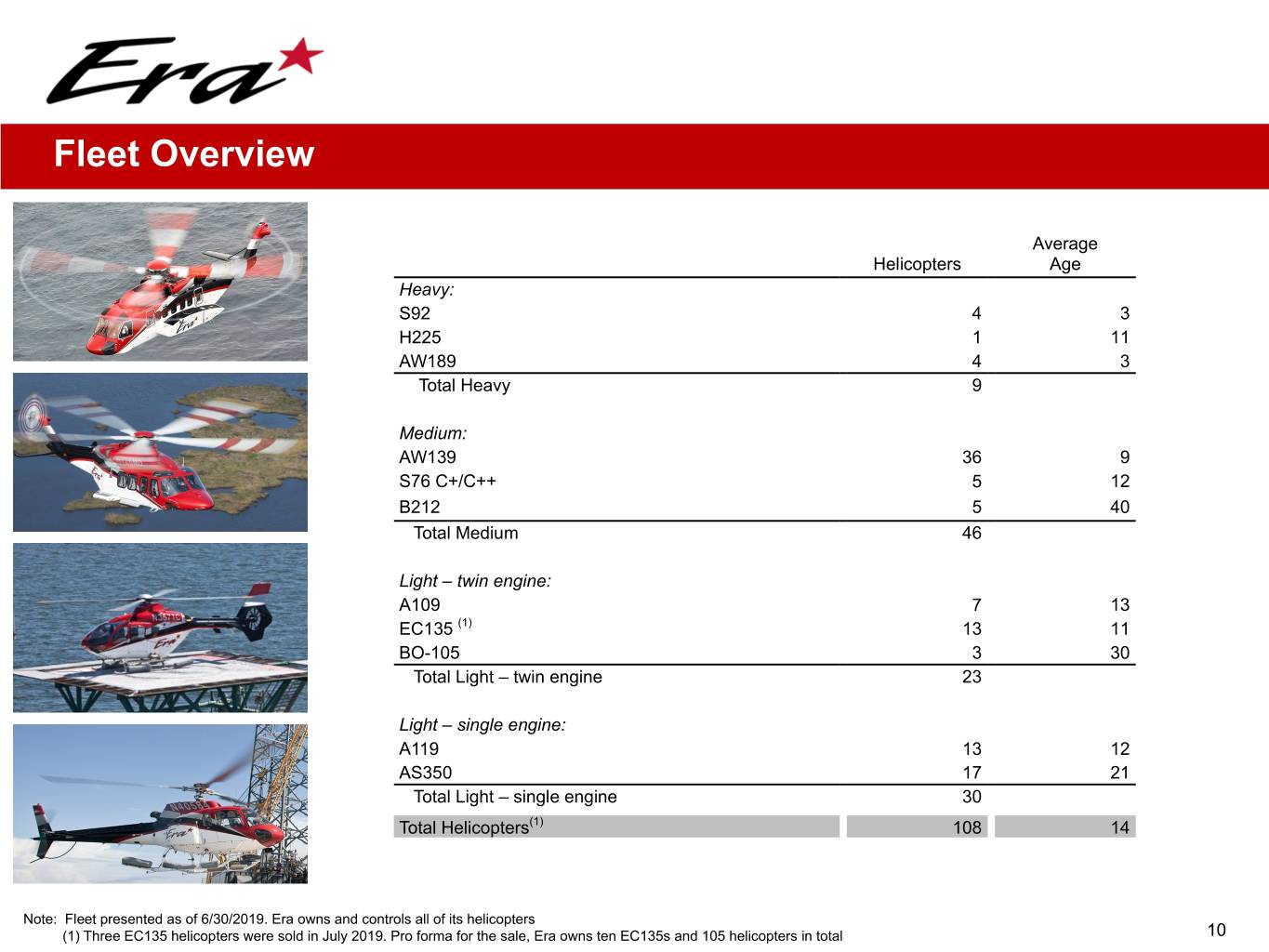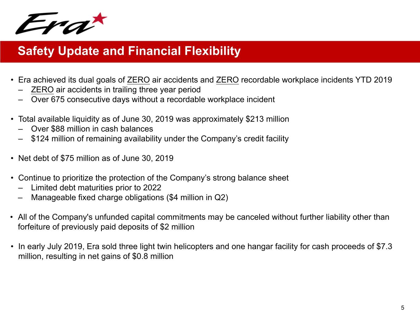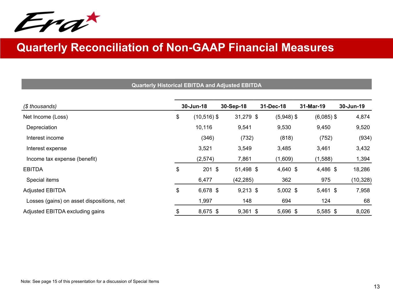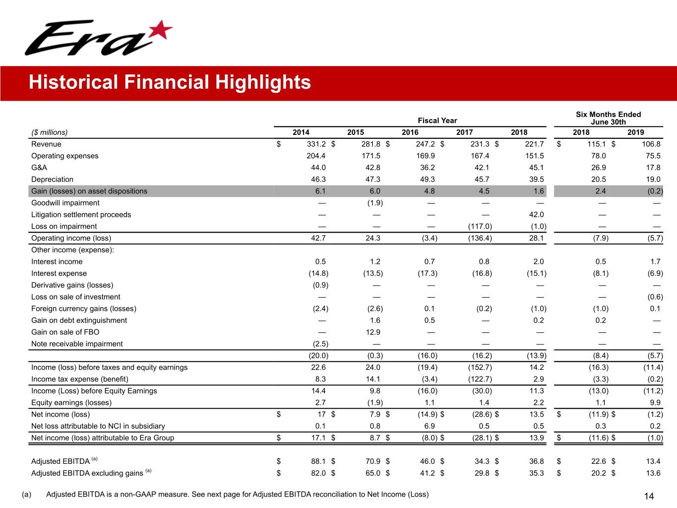 Historical Financial Highlights Six Months Ended Fiscal Year June 30th ($ millions) 2014 2015 2016 2017 2018 2018 2019 Revenue $ 331.2 $ 281.8 $ 247.2 $ 231.3 $ 221.7 $ 115.1 $ 106.8 Operating expenses 204.4 171.5 169.9 167.4 151.5 78.0 75.5 G&A 44.0 42.8 36.2 42.1 45.1 26.9 17.8 Depreciation 46.3 47.3 49.3 45.7 39.5 20.5 19.0 Gain (losses) on asset dispositions 6.1 6.0 4.8 4.5 1.6 2.4 (0.2) Goodwill impairment — (1.9) — — — — — Litigation settlement proceeds — — — — 42.0 — — Loss on impairment — — — (117.0) (1.0) — — Operating income (loss) 42.7 24.3 (3.4) (136.4) 28.1 (7.9) (5.7) Other income (expense): Interest income 0.5 1.2 0.7 0.8 2.0 0.5 1.7 Interest expense (14.8) (13.5) (17.3) (16.8) (15.1) (8.1) (6.9) Derivative gains (losses) (0.9) — — — — — — Loss on sale of investment — — — — — — (0.6) Foreign currency gains (losses) (2.4) (2.6) 0.1 (0.2) (1.0) (1.0) 0.1 Gain on debt extinguishment — 1.6 0.5 — 0.2 0.2 — Gain on sale of FBO — 12.9 — — — — — Note receivable impairment (2.5) — — — — — — (20.0) (0.3) (16.0) (16.2) (13.9) (8.4) (5.7) Income (loss) before taxes and equity earnings 22.6 24.0 (19.4) (152.7) 14.2 (16.3) (11.4) Income tax expense (benefit) 8.3 14.1 (3.4) (122.7) 2.9 (3.3) (0.2) Income (Loss) before Equity Earnings 14.4 9.8 (16.0) (30.0) 11.3 (13.0) (11.2) Equity earnings (losses) 2.7 (1.9) 1.1 1.4 2.2 1.1 9.9 Net income (loss) $ 17 $ 7.9 $ (14.9) $ (28.6) $ 13.5 $ (11.9) $ (1.2) Net loss attributable to NCI in subsidiary 0.1 0.8 6.9 0.5 0.5 0.3 0.2 Net income (loss) attributable to Era Group $ 17.1 $ 8.7 $ (8.0) $ (28.1) $ 13.9 $ (11.6) $ (1.0) Adjusted EBITDA (a) $ 88.1 $ 70.9 $ 46.0 $ 34.3 $ 36.8 $ 22.6 $ 13.4 Adjusted EBITDA excluding gains (a) $ 82.0 $ 65.0 $ 41.2 $ 29.8 $ 35.3 $ 20.2 $ 13.6 (a) Adjusted EBITDA is a non-GAAP measure. See next page for Adjusted EBITDA reconciliation to Net Income (Loss) 14