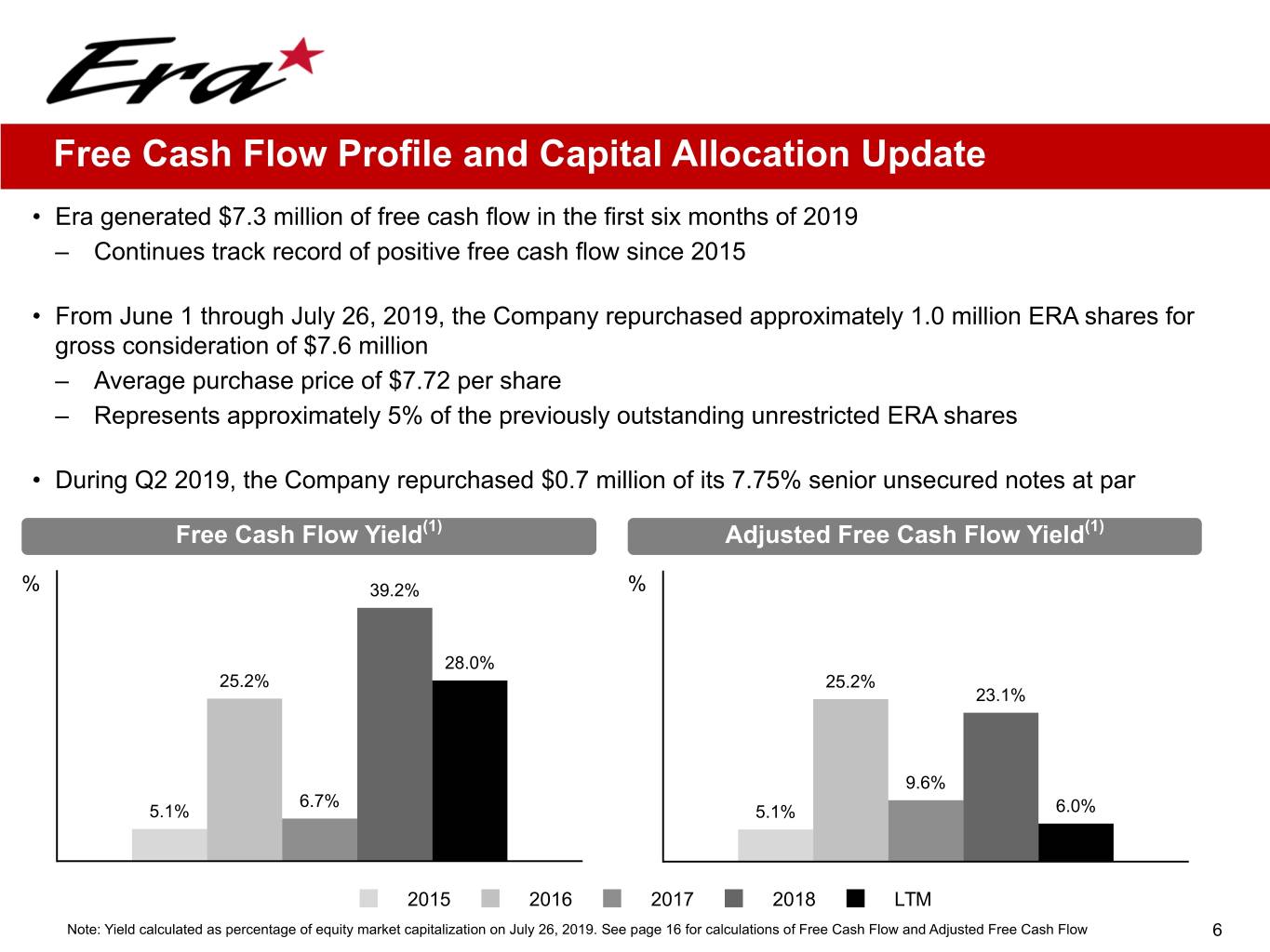 Safety Update and Financial Flexibility • Era achieved its dual goals of ZERO air accidents and ZERO recordable workplace incidents YTD 2019 – ZERO air accidents in trailing three year period – Over 675 consecutive days without a recordable workplace incident • Total available liquidity as of June 30, 2019 was approximately $213 million – Over $88 million in cash balances – $124 million of remaining availability under the Company’s credit facility • Net debt of $75 million as of June 30, 2019 • Continue to prioritize the protection of the Company’s strong balance sheet – Limited debt maturities prior to 2022 – Manageable fixed charge obligations ($4 million in Q2) • All of the Company's unfunded capital commitments may be canceled without further liability other than forfeiture of previously paid deposits of $2 million • In early July 2019, Era sold three light twin helicopters and one hangar facility for cash proceeds of $7.3 million, resulting in net gains of $0.8 million 5